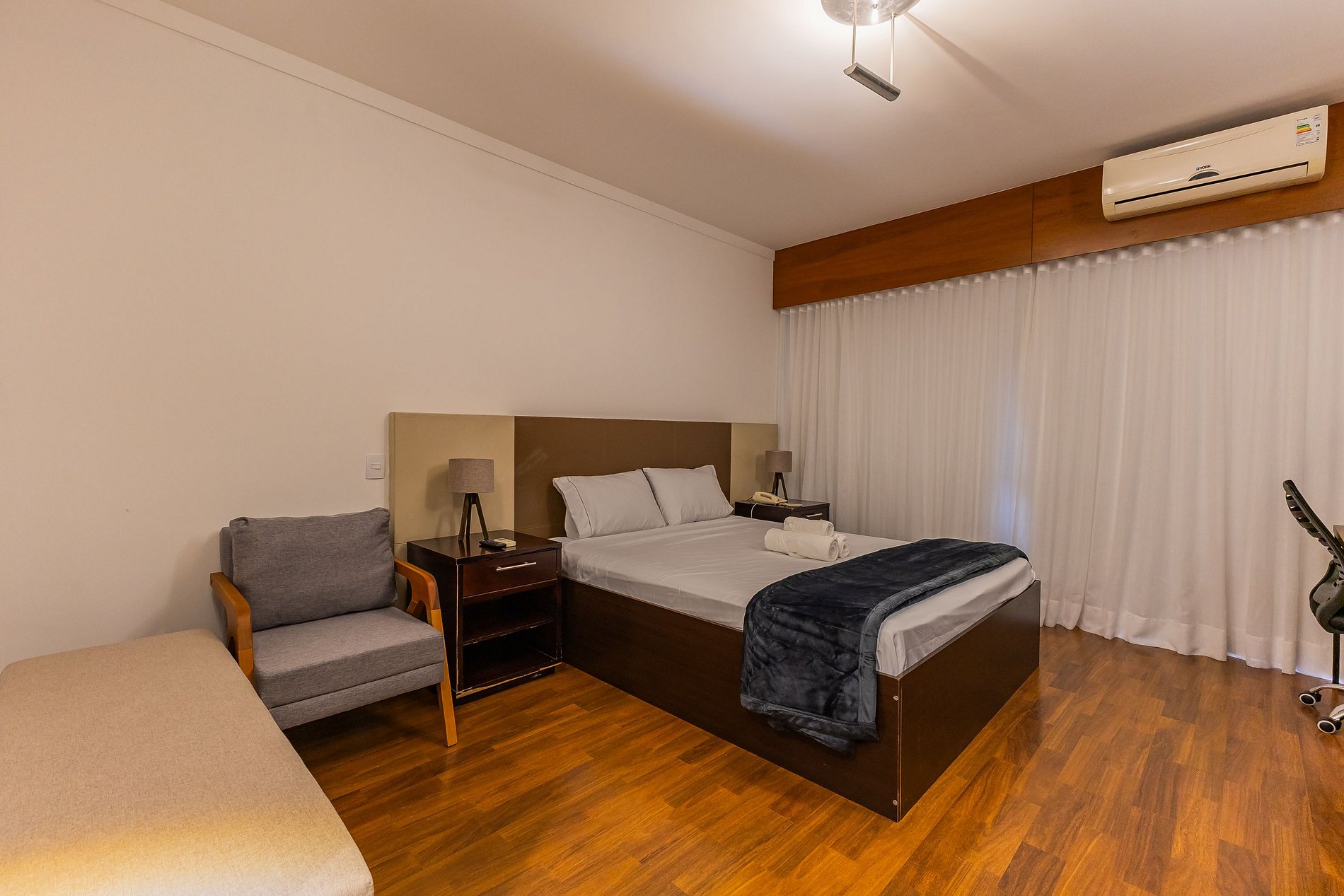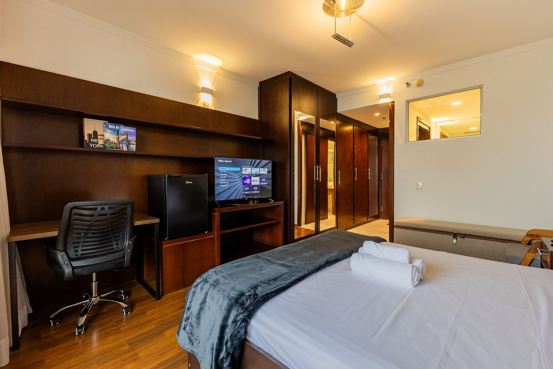 • Tecnologia e praticidade: Wi-Fi de alta velocidade, TV a cabo e espaço home office com cadeira ergonômica