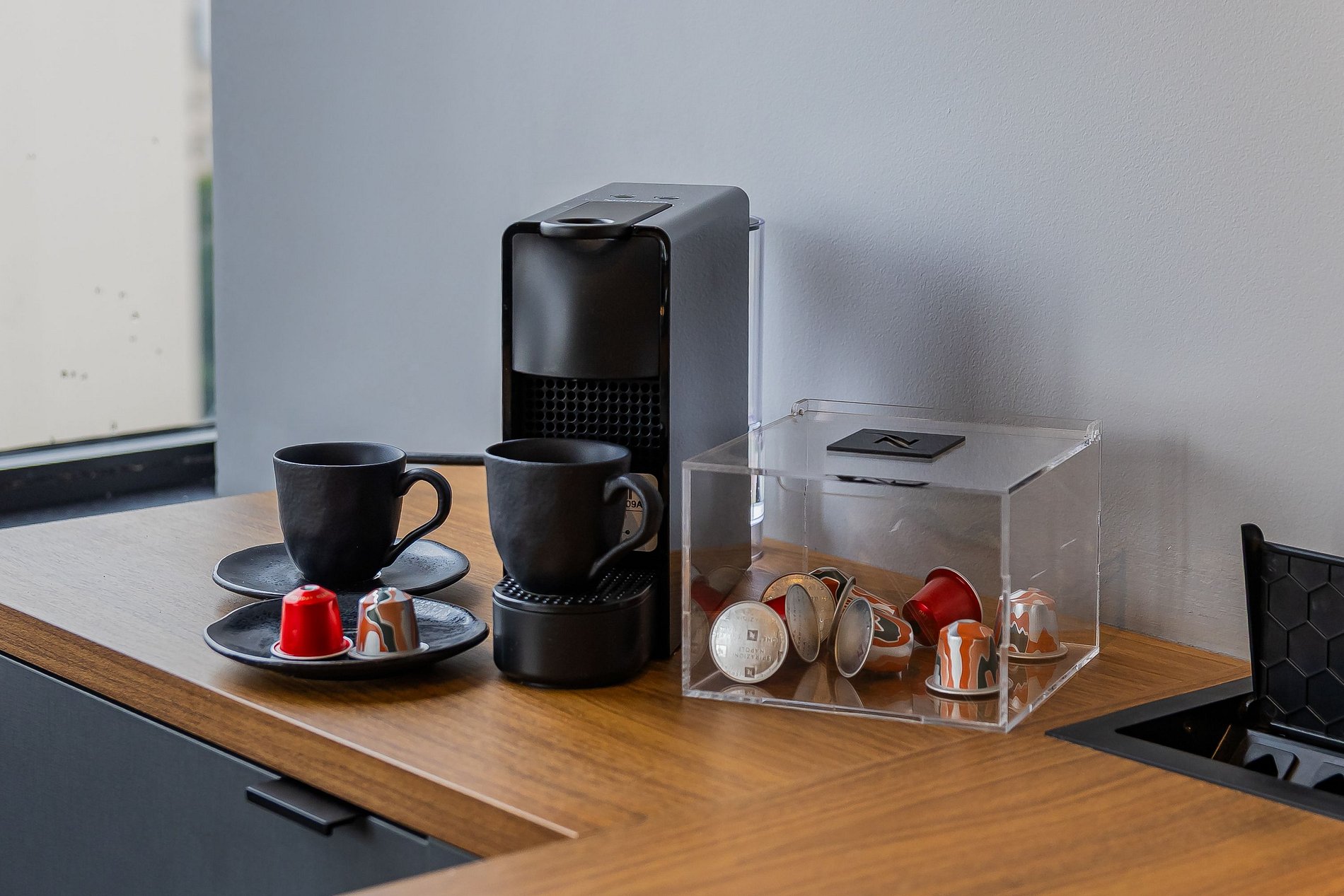 • Cozinha completa com geladeira, fogão de indução, forno elétrico, micro-ondas, cafeteira, filtro de água, utensílios e taças de vinho.
