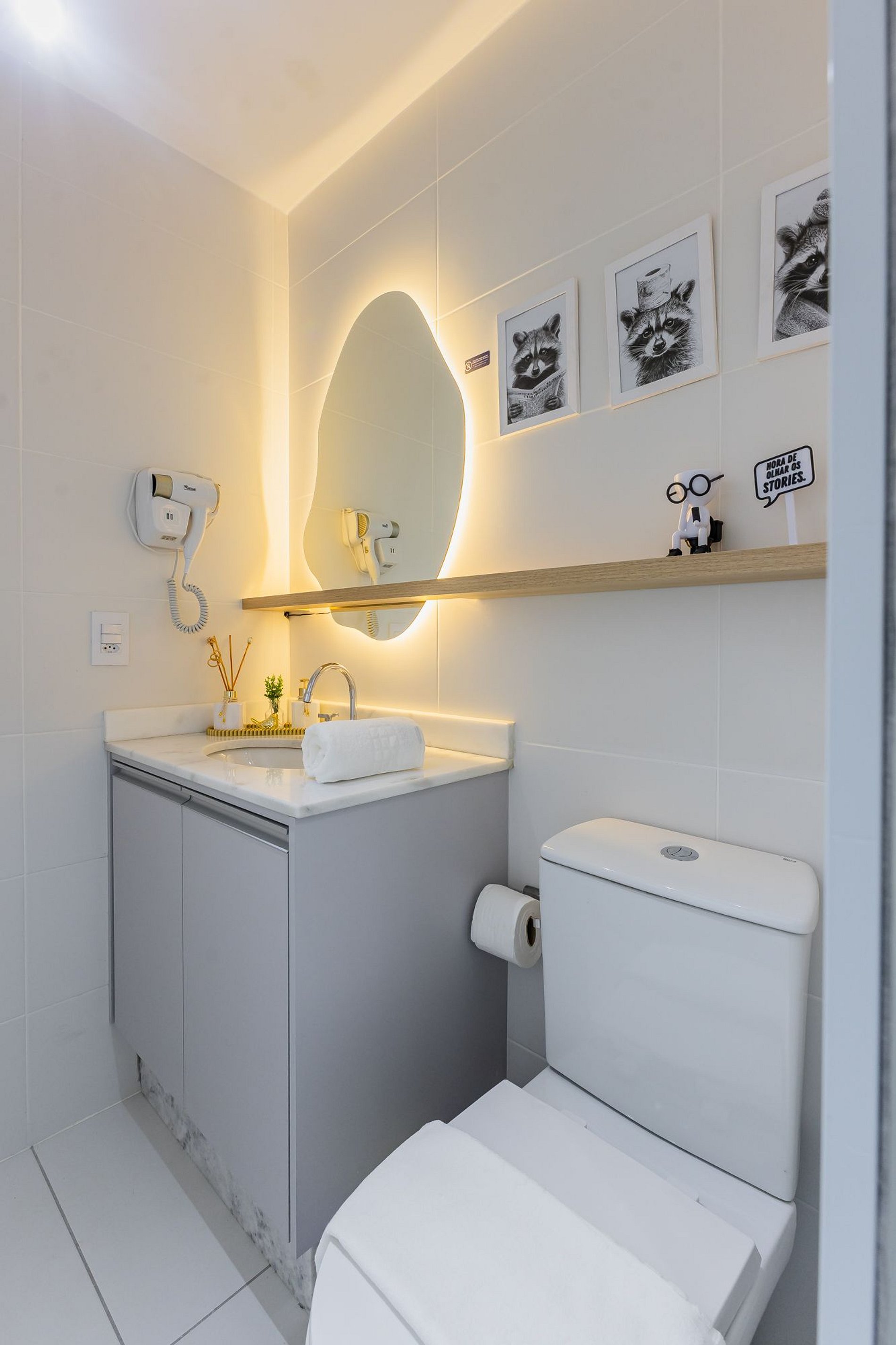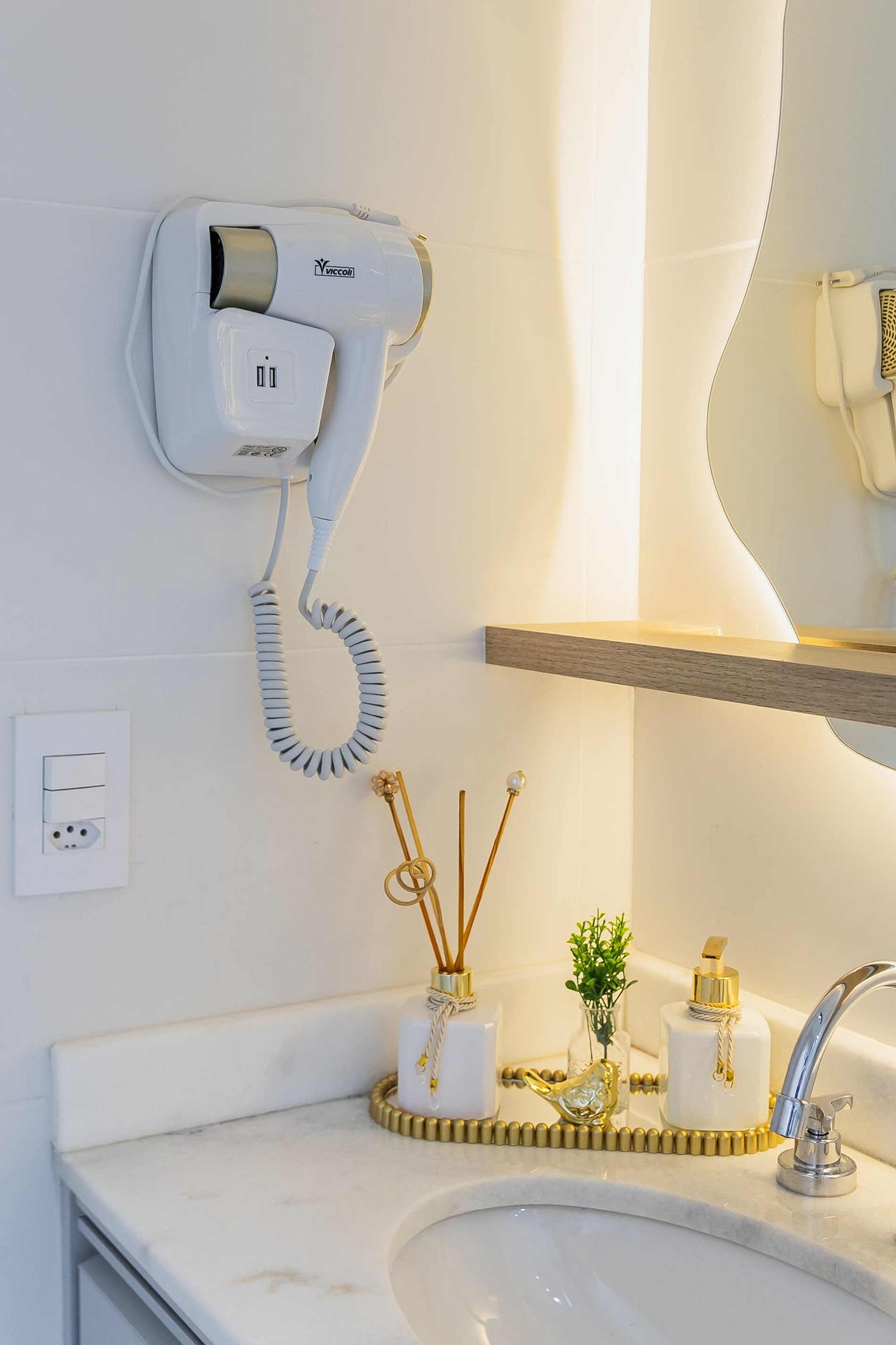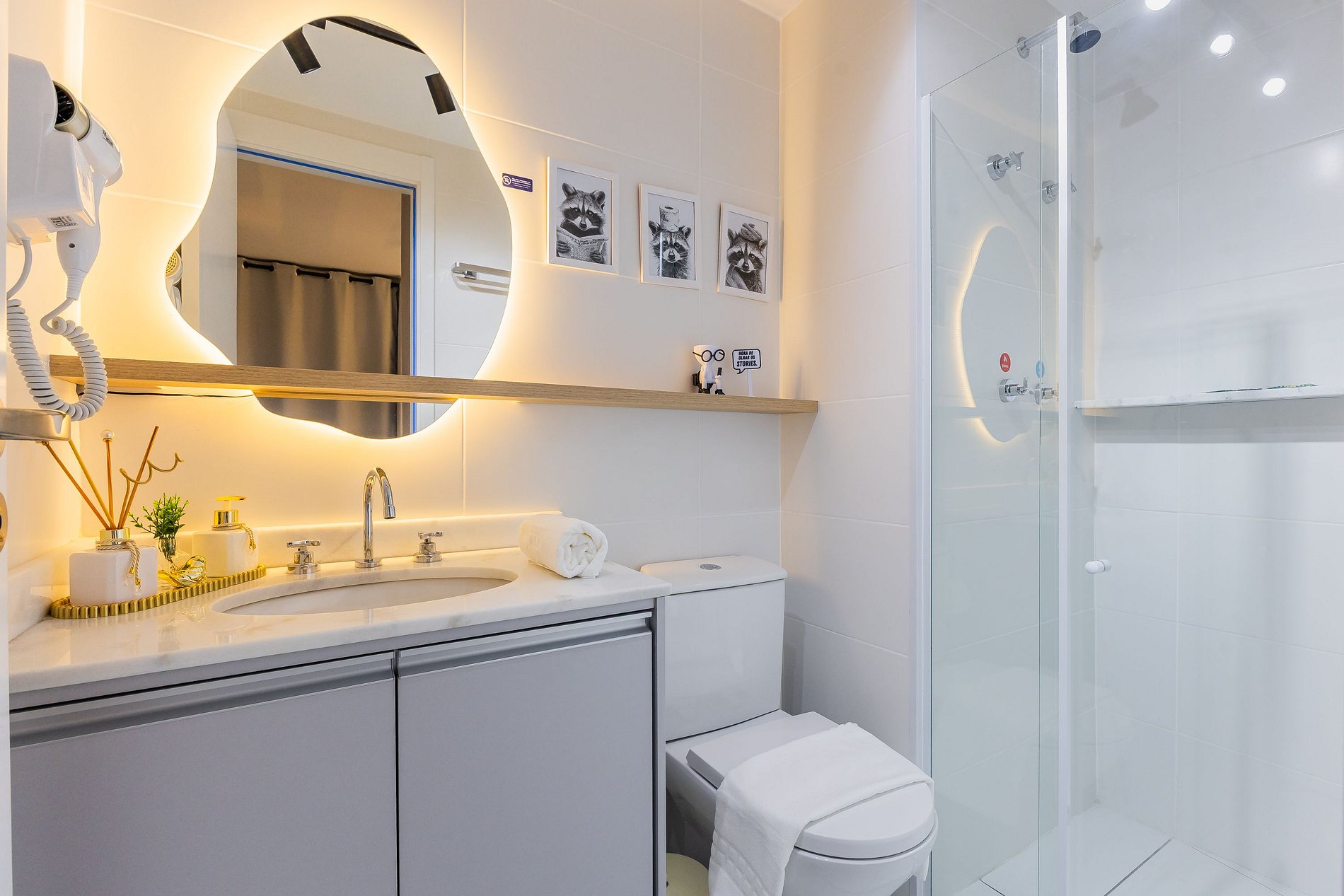 • Banheiro moderno com secador de cabelo.