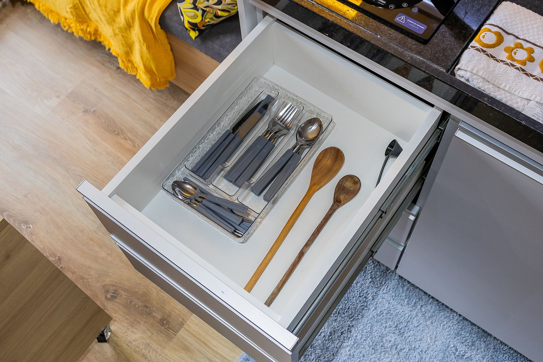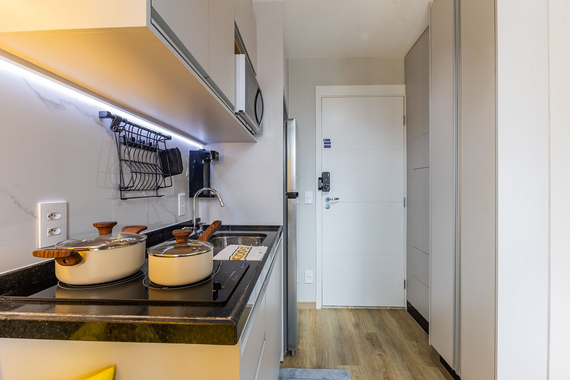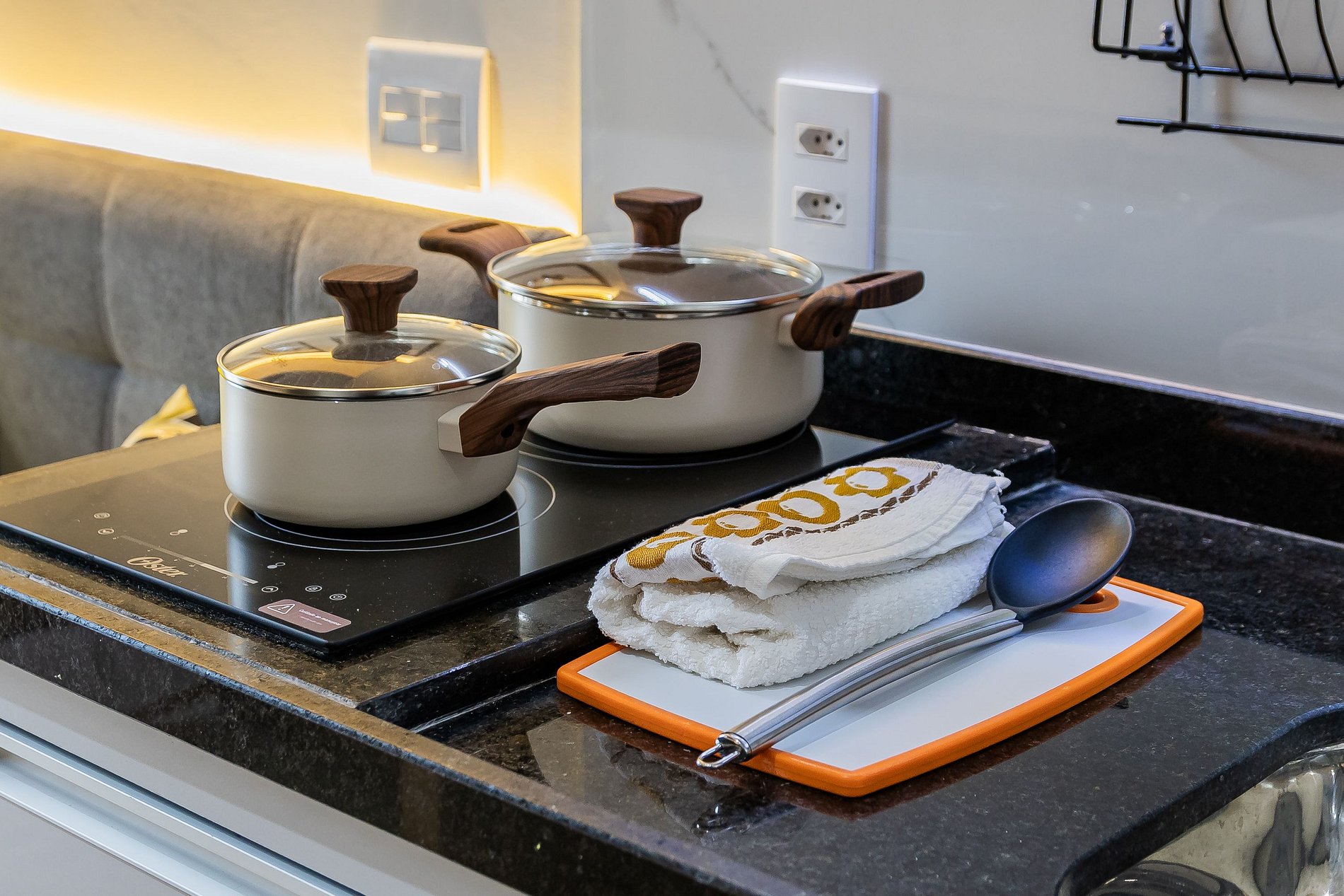 • Cozinha completa com cooktop de indução, micro-ondas, geladeira, forno elétrico, utensílios básicos, perfeita para quem gosta de autonomia.