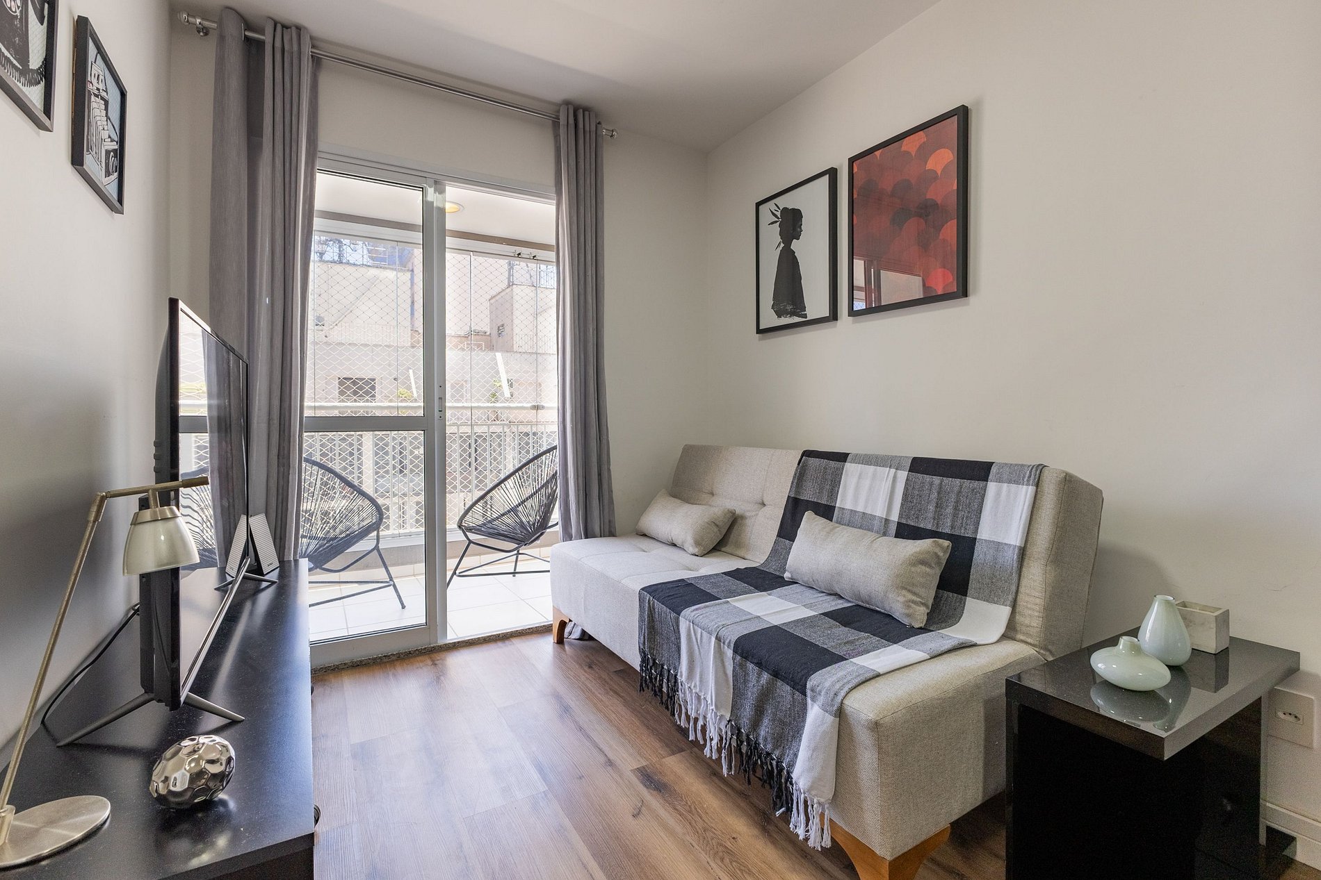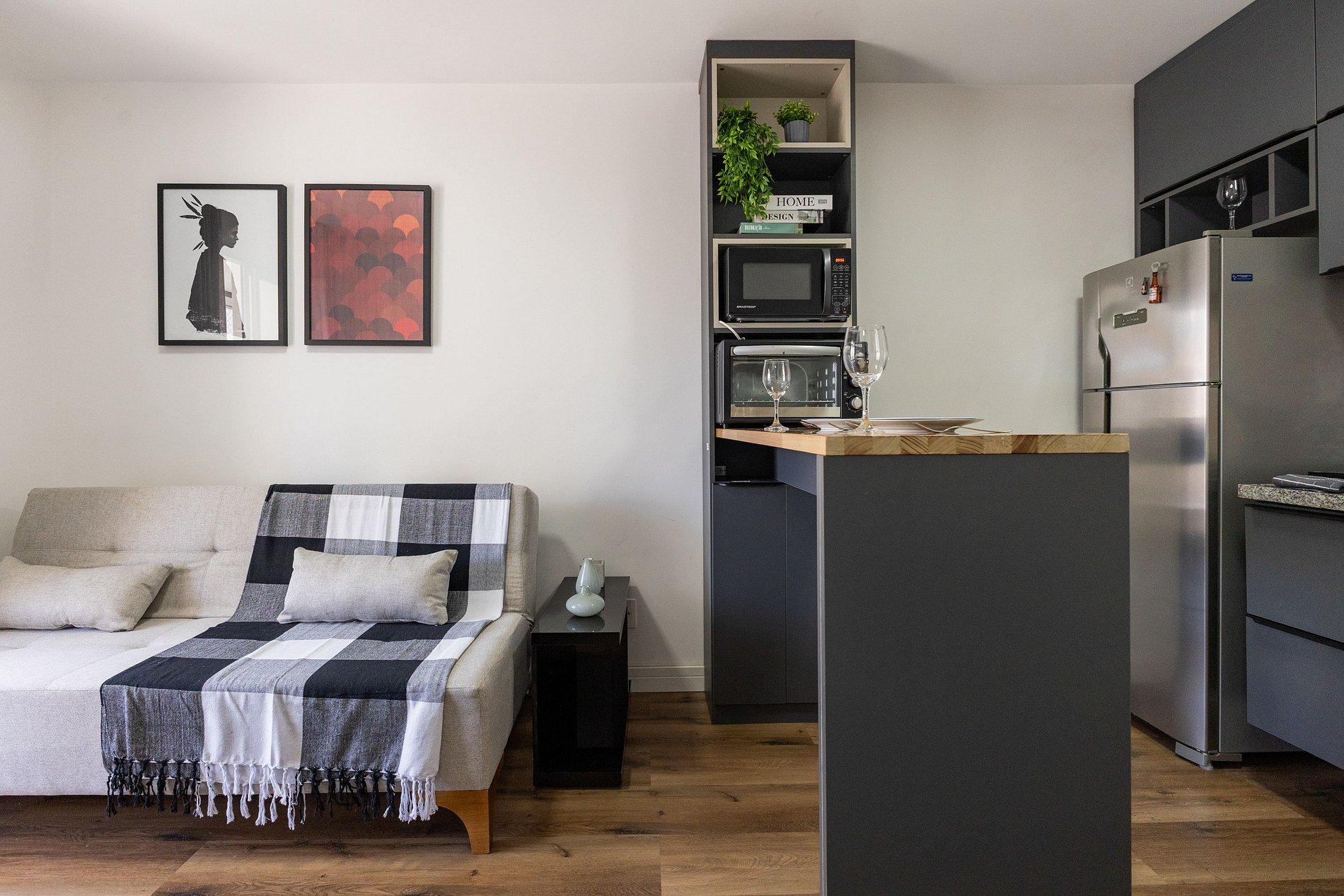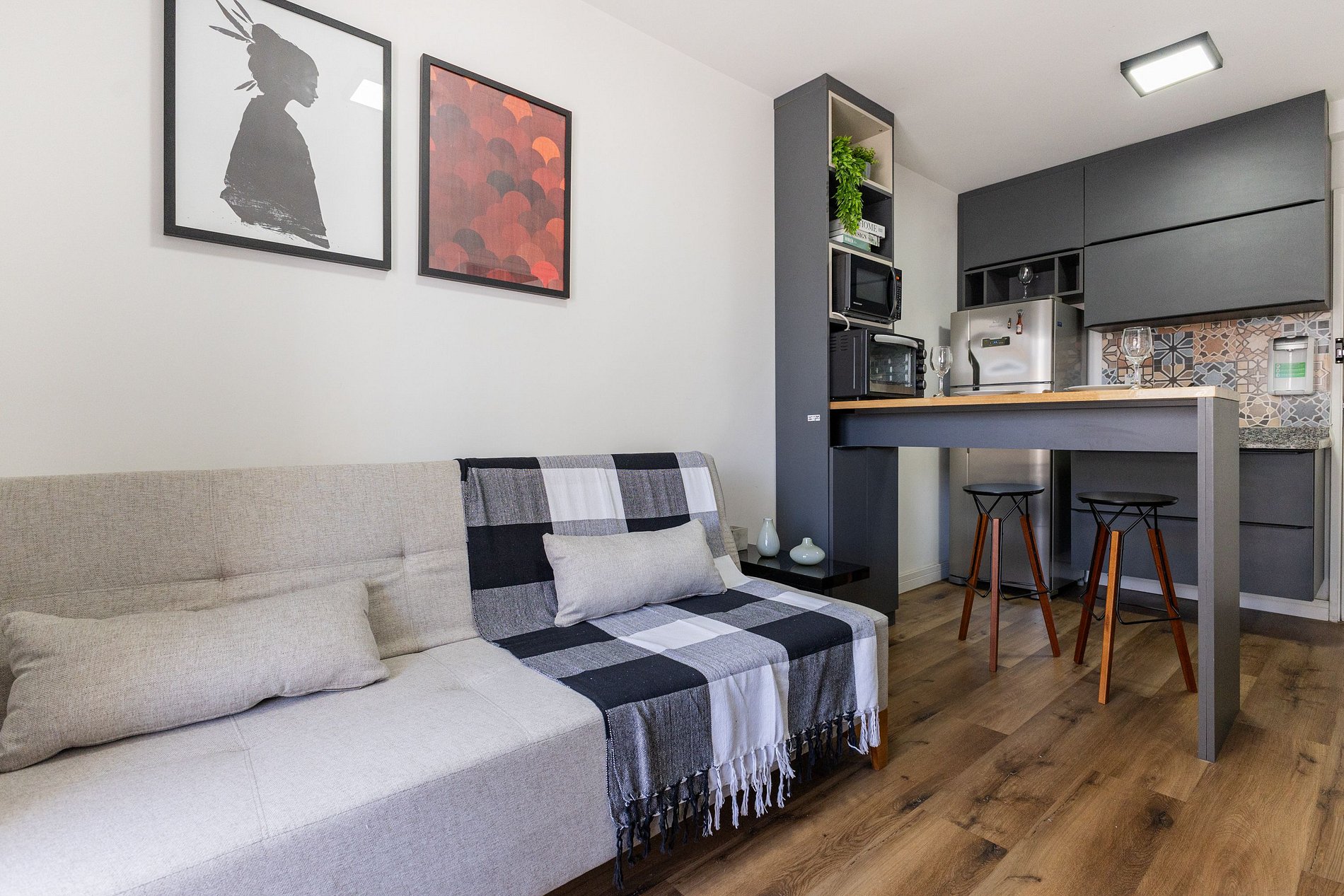 Apartamento moderno no 7º andar, com projeto contemporâneo e móveis planejados que aproveitam cada detalhe dos 35m² para oferecer praticidade, conforto e bem-estar. O ambiente integrado conta com cama de casal confortável, sofá-cama, área de jantar e ar-condicionado, criando um espaço ideal tanto para relaxar quanto para trabalhar.