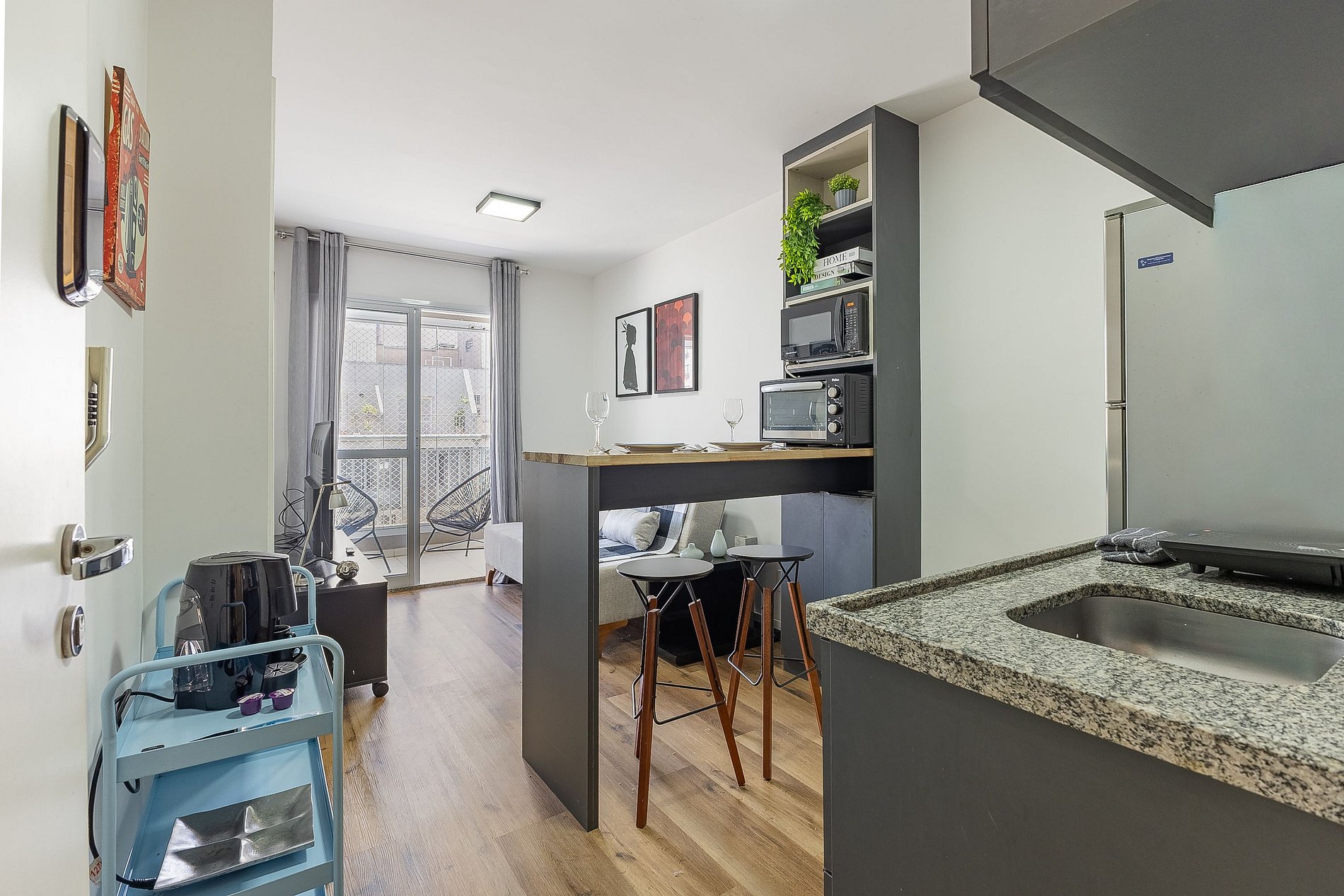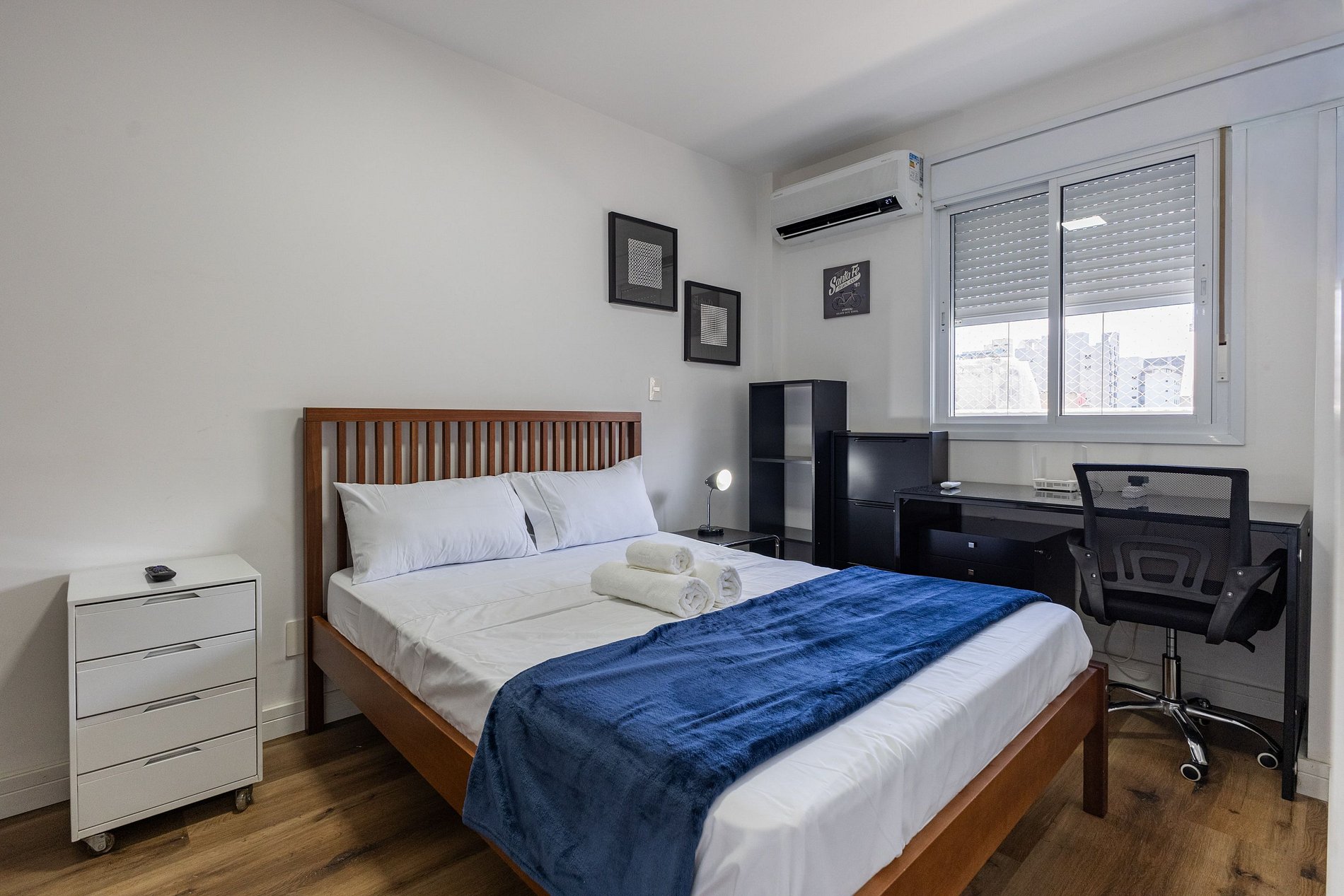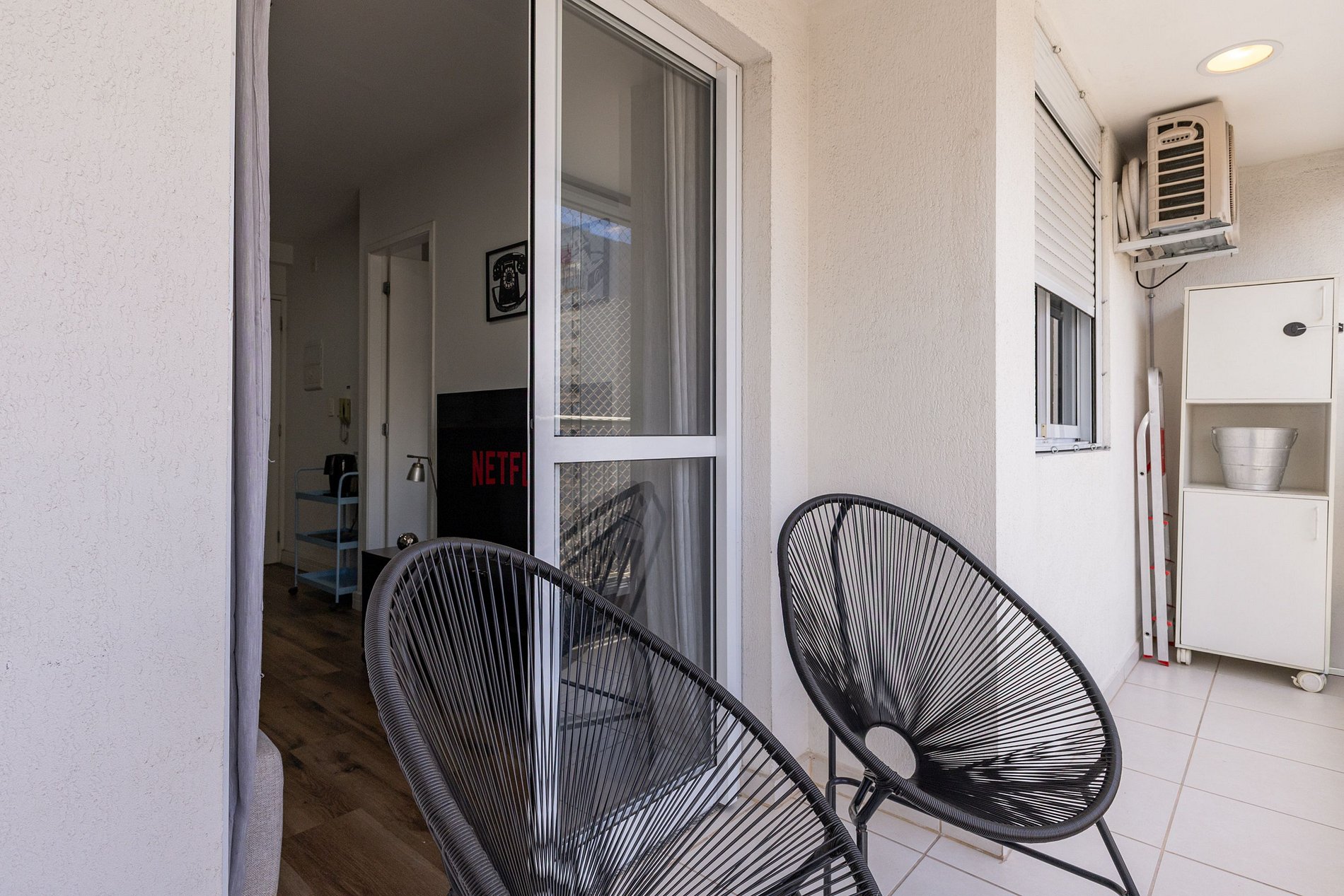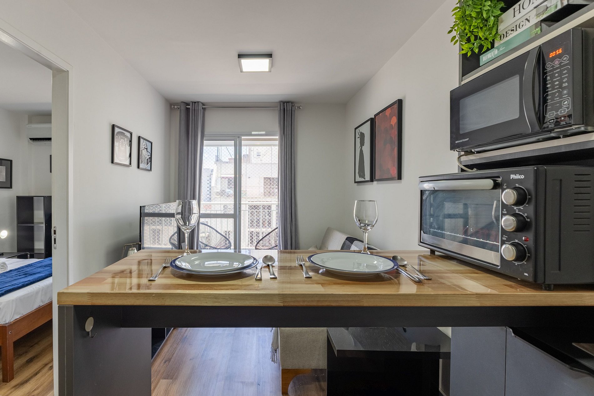 Apartamento moderno no 7º andar, com projeto contemporâneo e móveis planejados que aproveitam cada detalhe dos 35m² para oferecer praticidade, conforto e bem-estar. O ambiente integrado conta com cama de casal confortável, sofá-cama, área de jantar e ar-condicionado, criando um espaço ideal tanto para relaxar quanto para trabalhar.