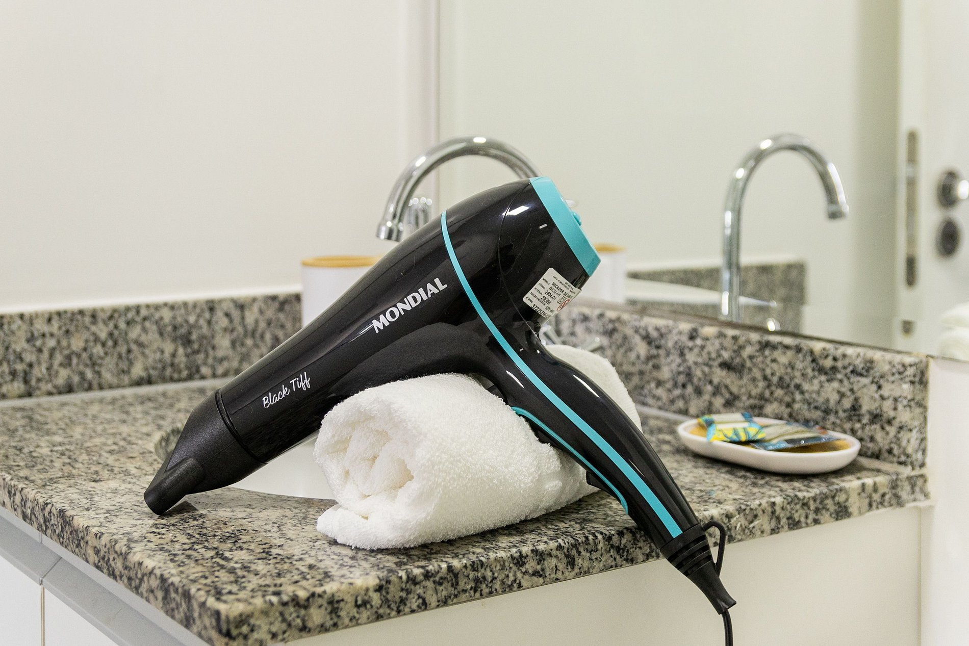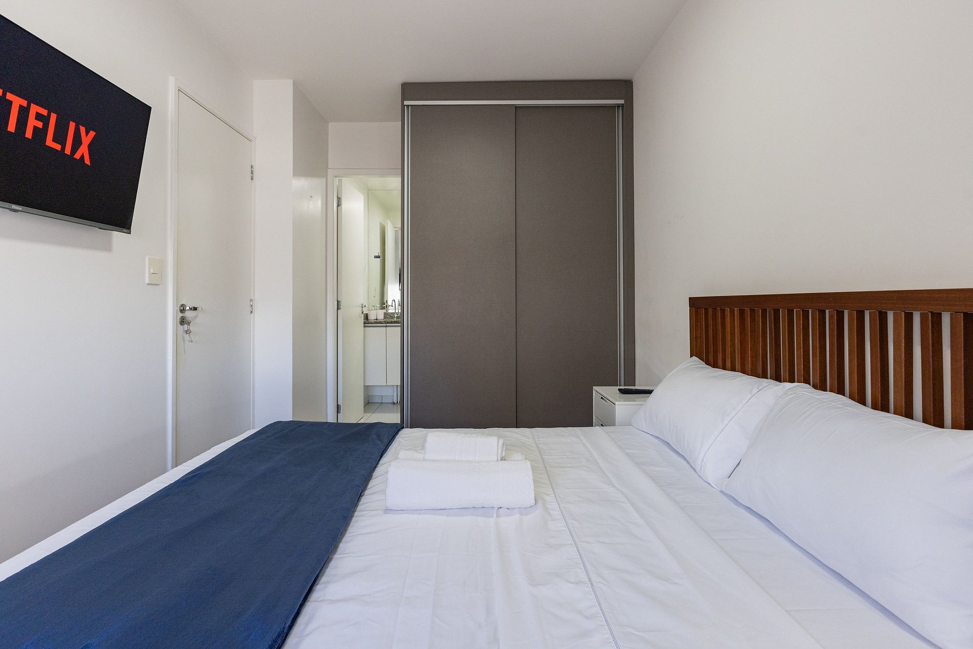Para maior comodidade, o apartamento oferece 1 vaga de garagem, smart TV com aplicativos, TV aberta, Wi-Fi de alta velocidade, cortina black-out no quarto, vaporizador de roupas e secador de cabelo. O banheiro possui chuveiro a gás, garantindo banhos mais confortáveis.