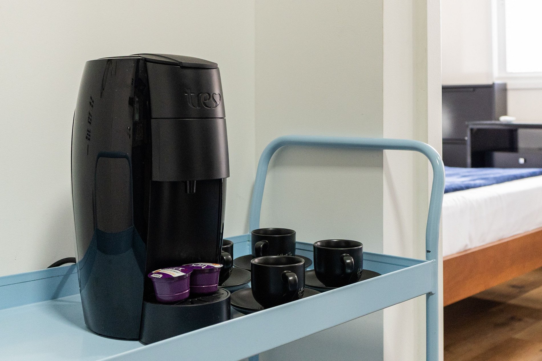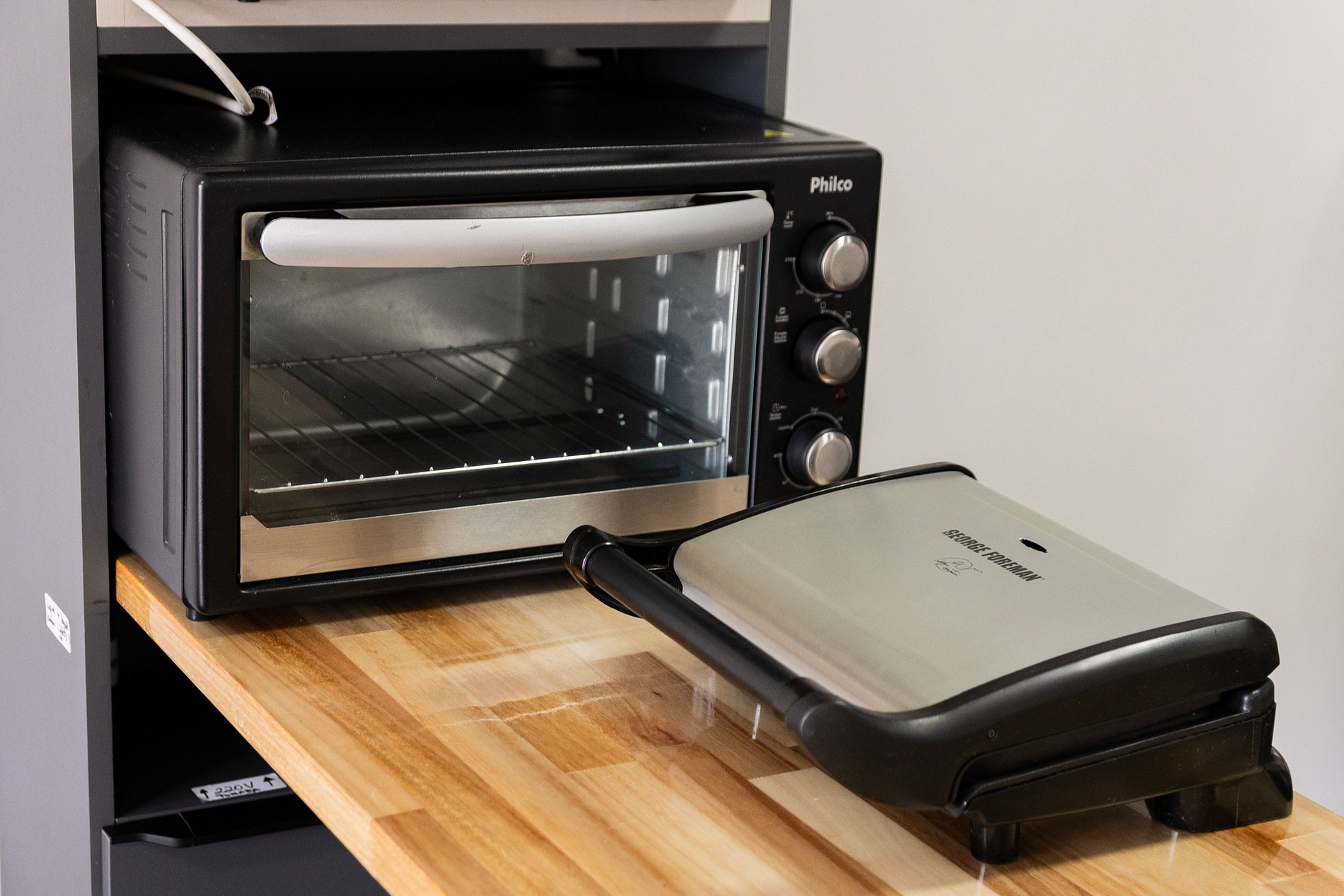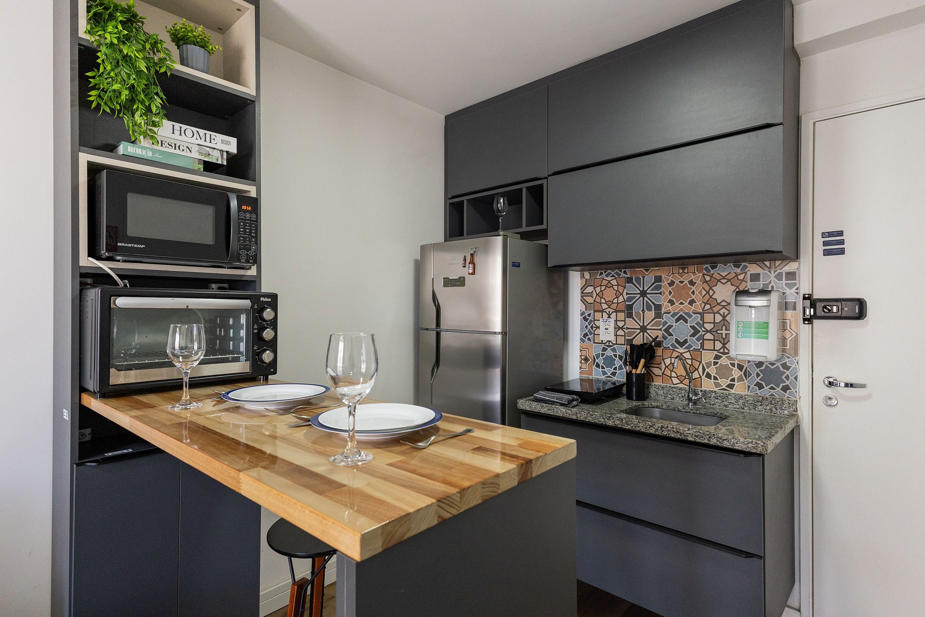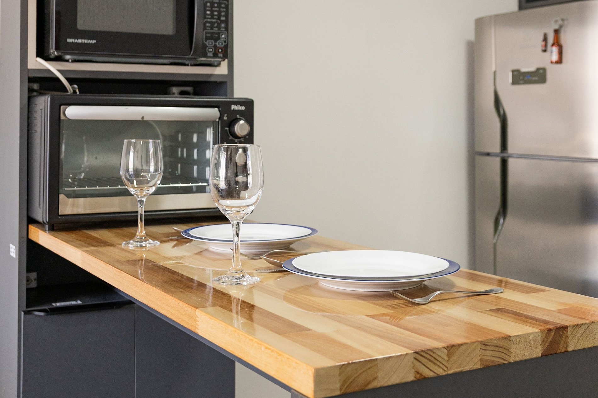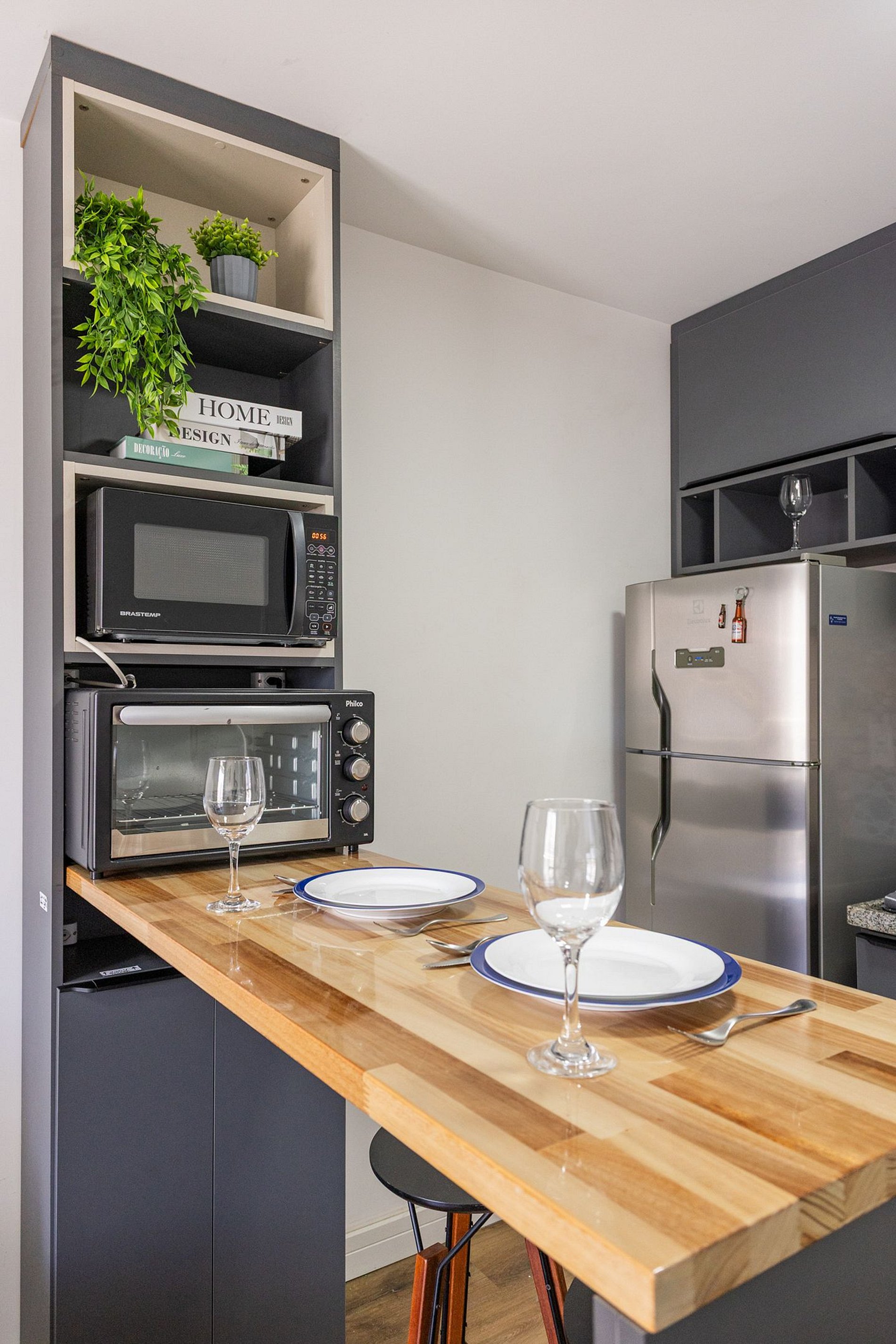- Cozinha com geladeira, fogão de indução, micro-ondas e cafeteira