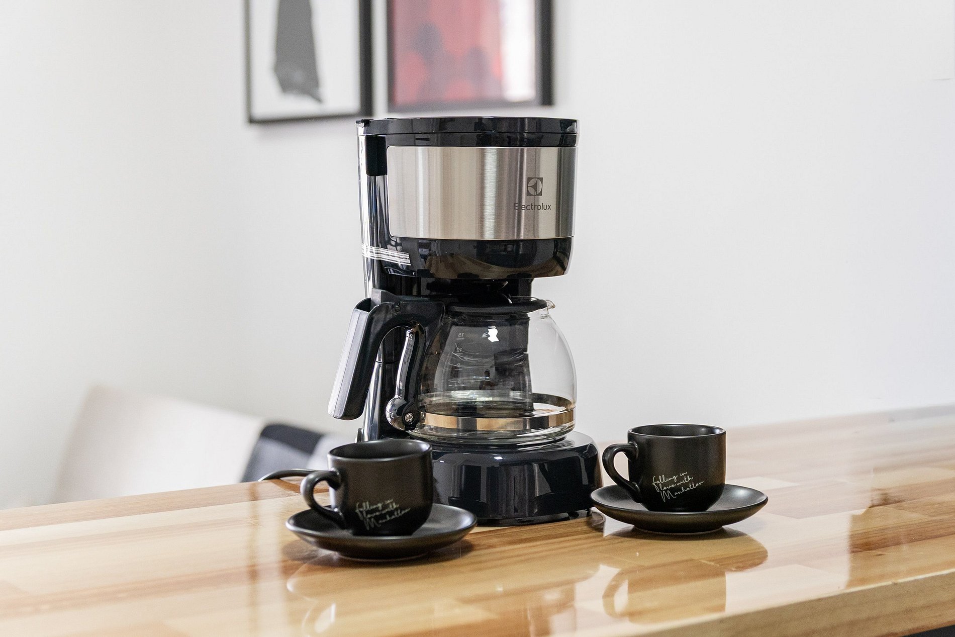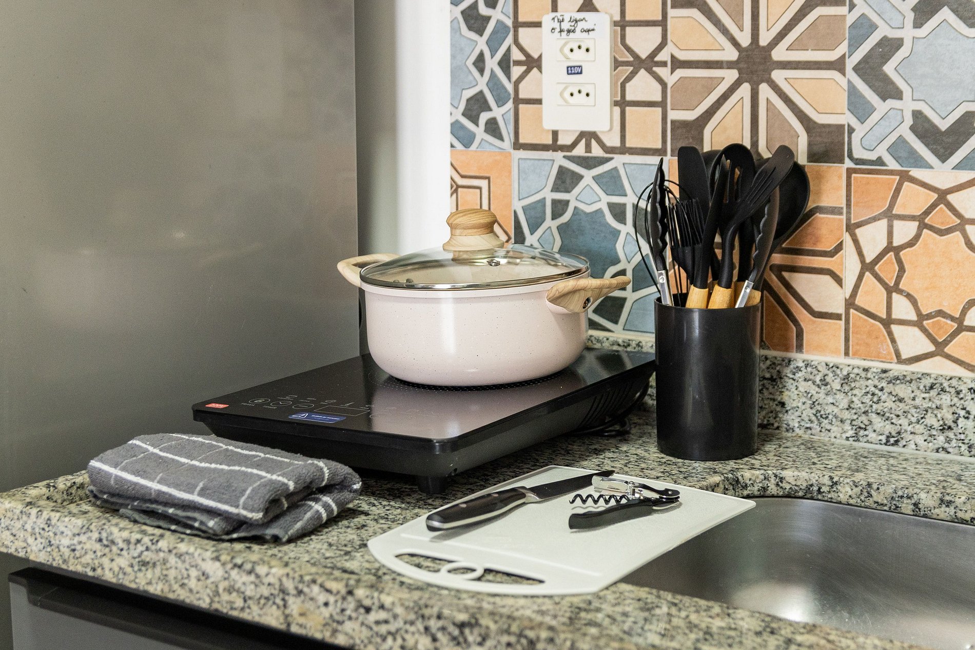A cozinha é equipada com tudo o que você precisa para o dia a dia: geladeira, fogão de indução, micro-ondas, cafeteira, sanduicheira, pipoqueira, panelas, frigideiras, talheres, pratos, copos, xícaras, taças de vinho e utensílios completos.