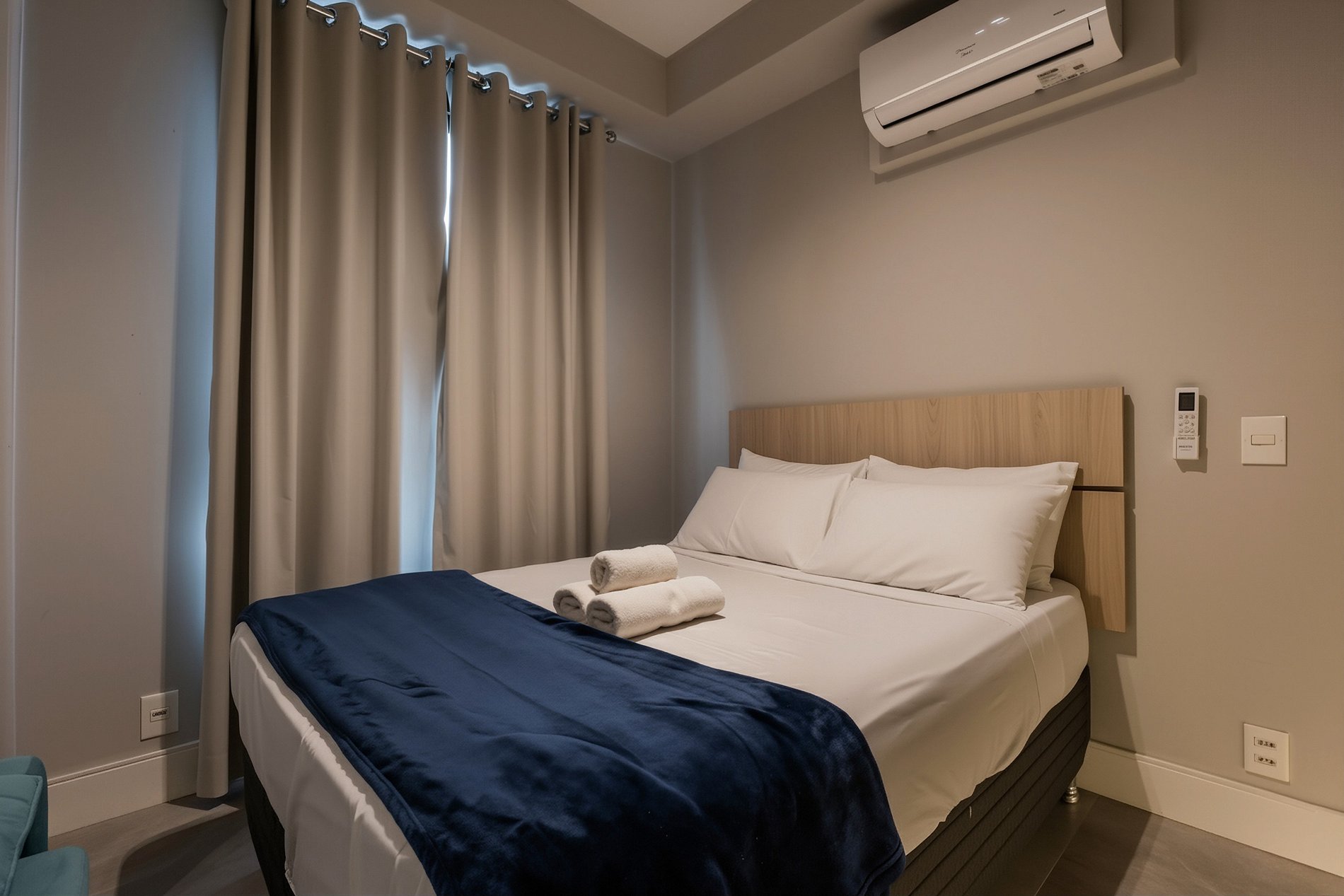 - Ar-condicionado, cortinas blackout e cozinha equipada
