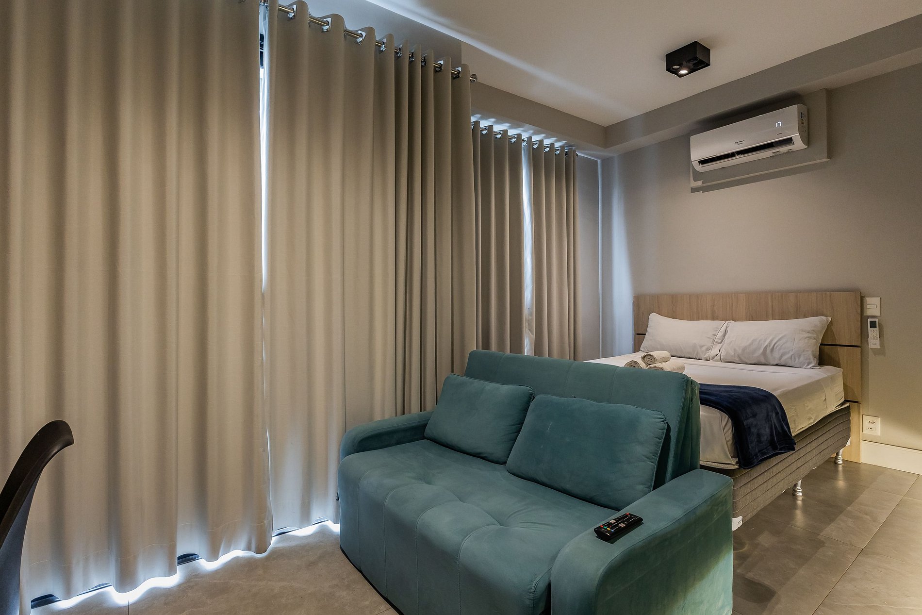 - Ar-condicionado, cortinas blackout e cozinha equipada