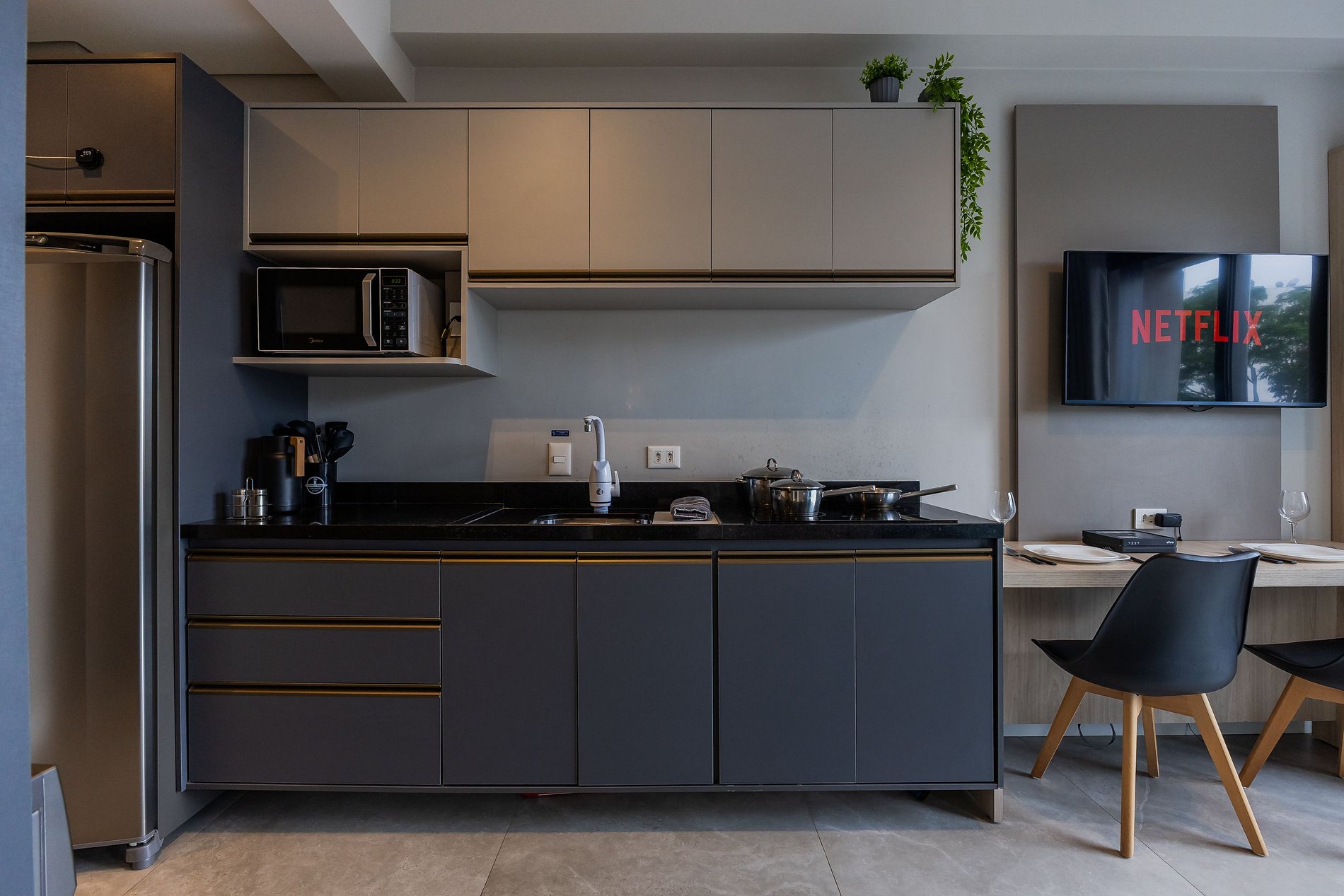 • Cozinha completa equipada com geladeira, micro-ondas, cooktop, utensílios e cafeteira, perfeita para preparar refeições rápidas.
