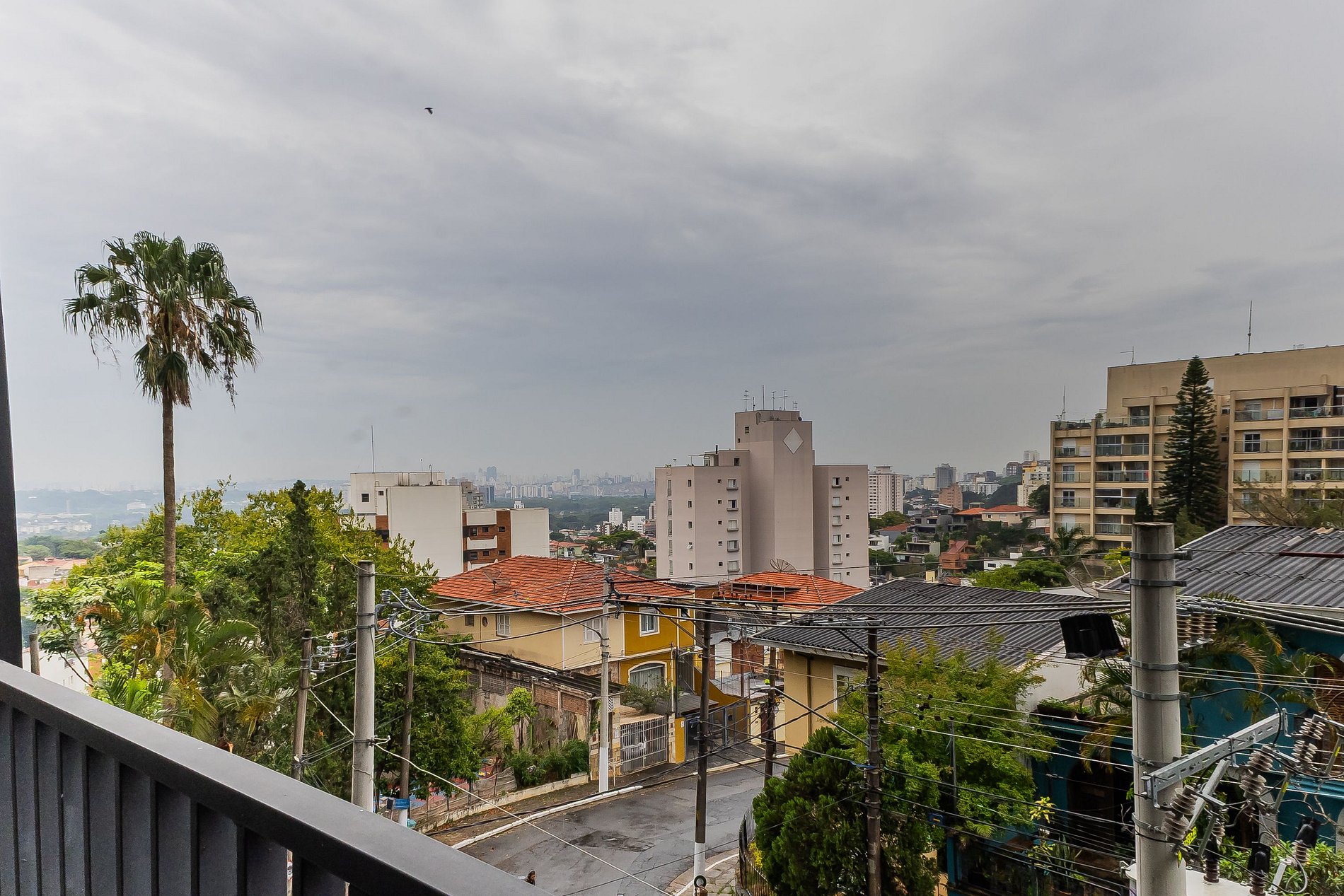 Studios com varanda e AC, rua arborizada e tranquila.