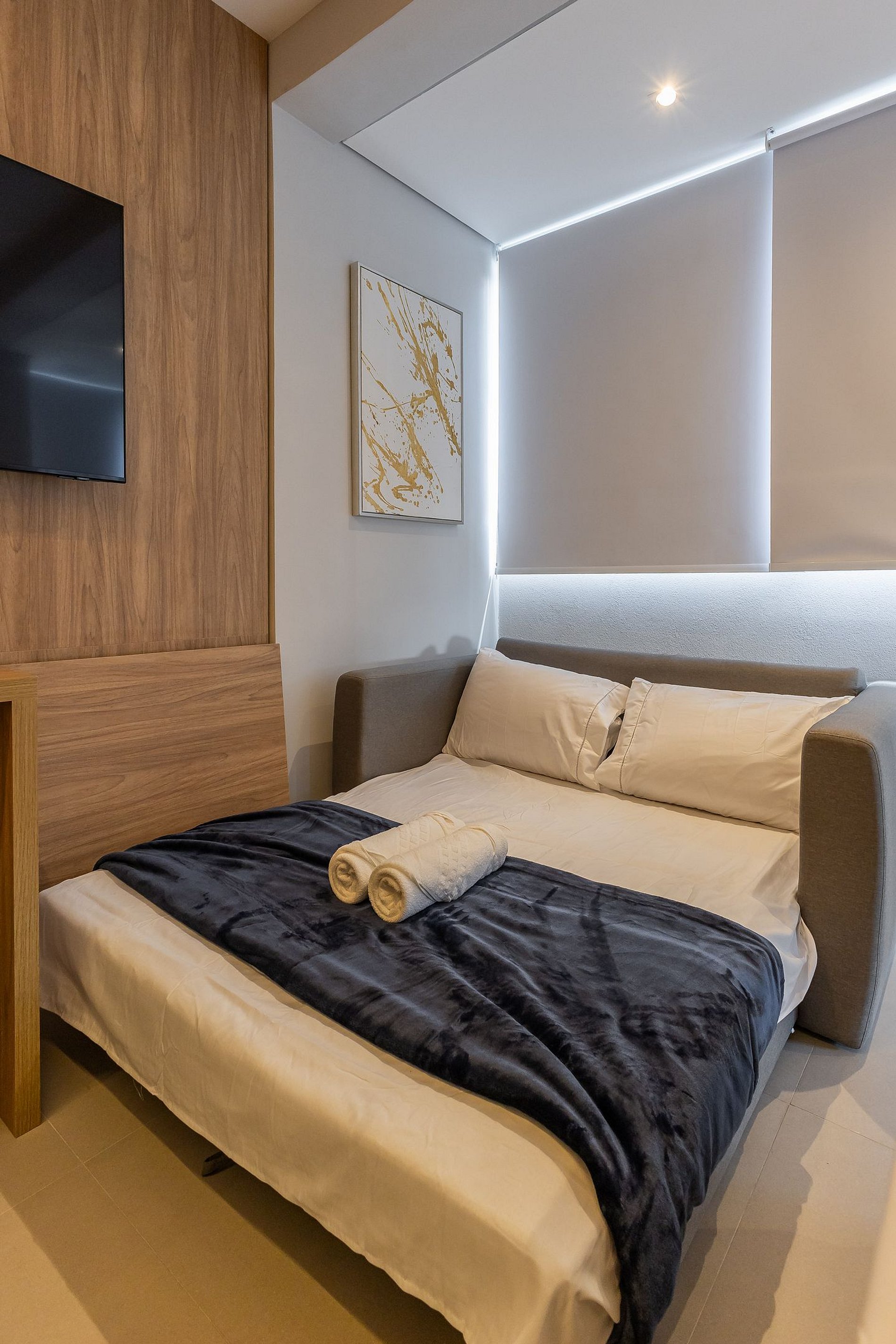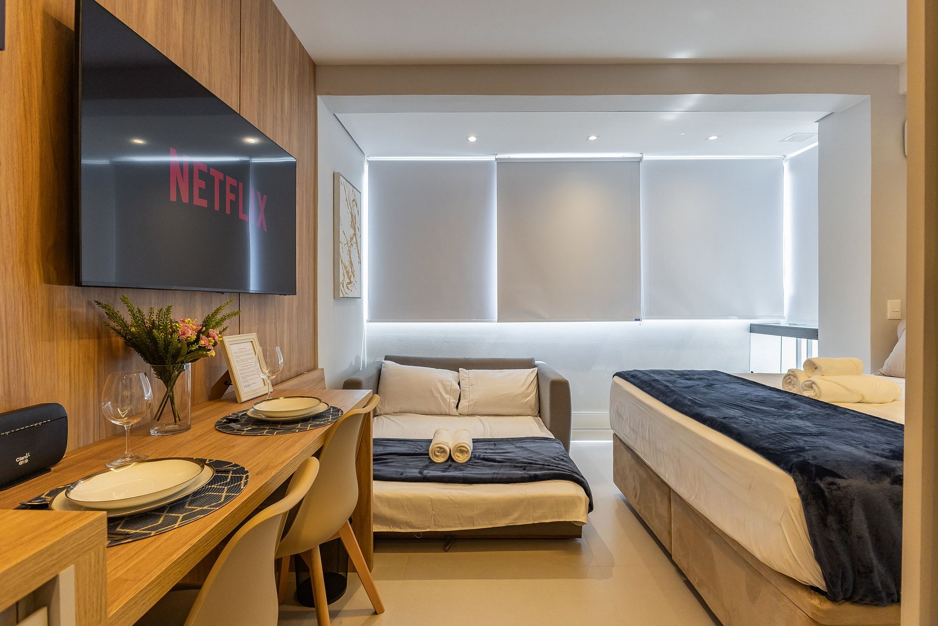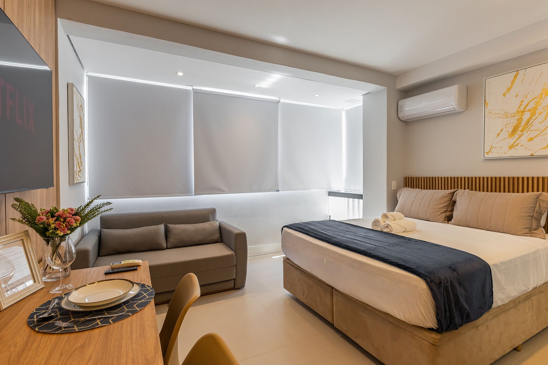 • Studio para até 4 pessoas, com cama queen e sofá-cama casal, acomodando com conforto;