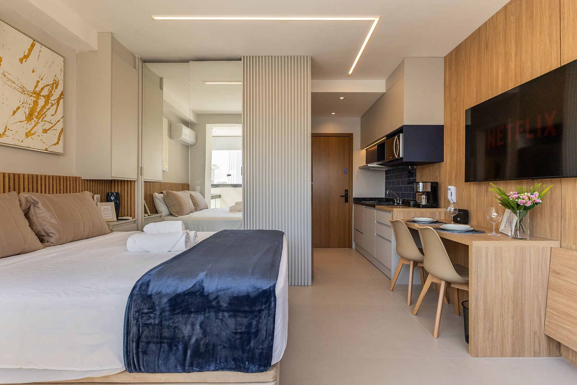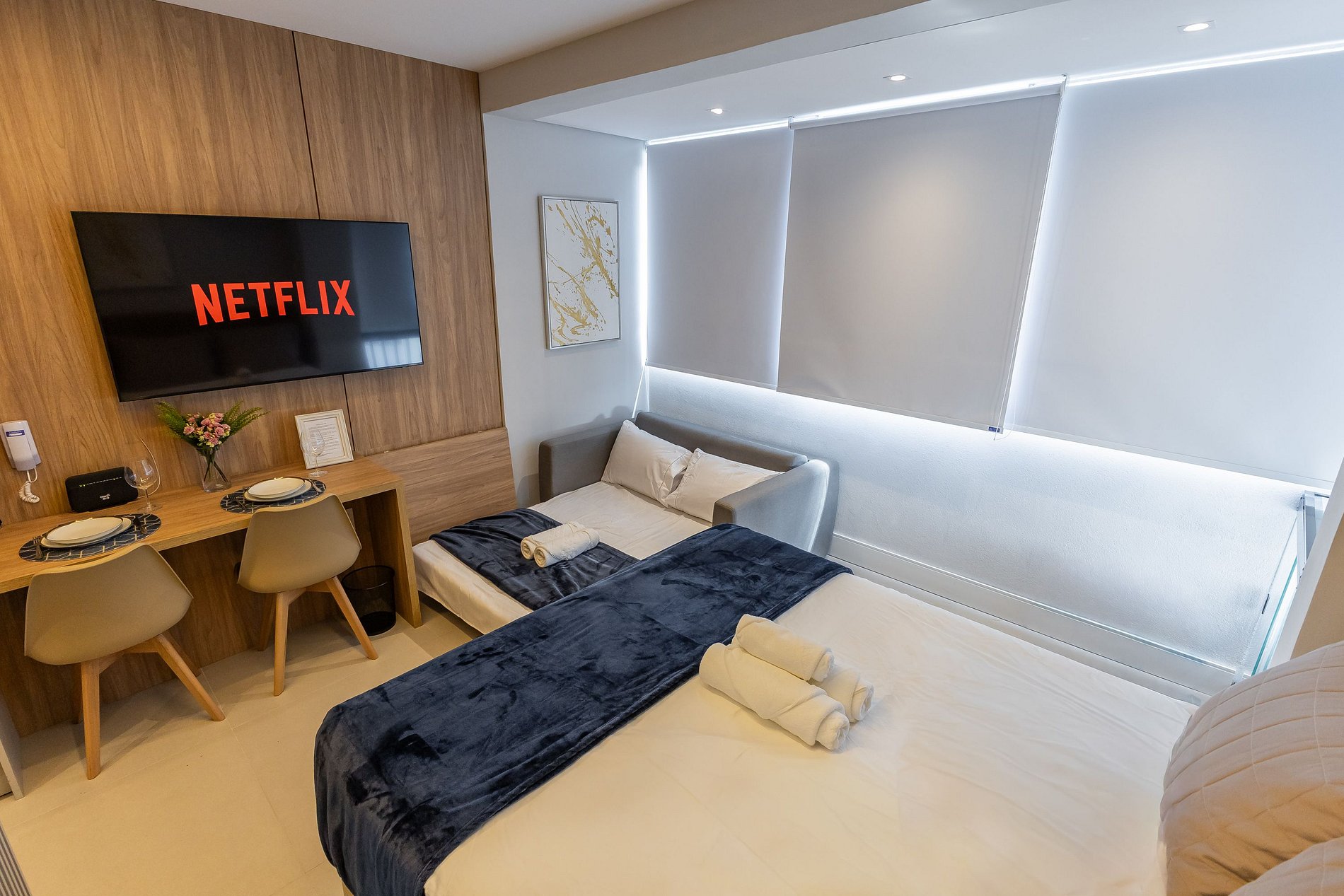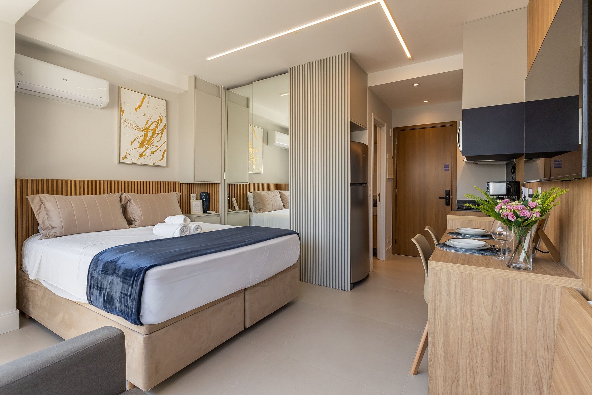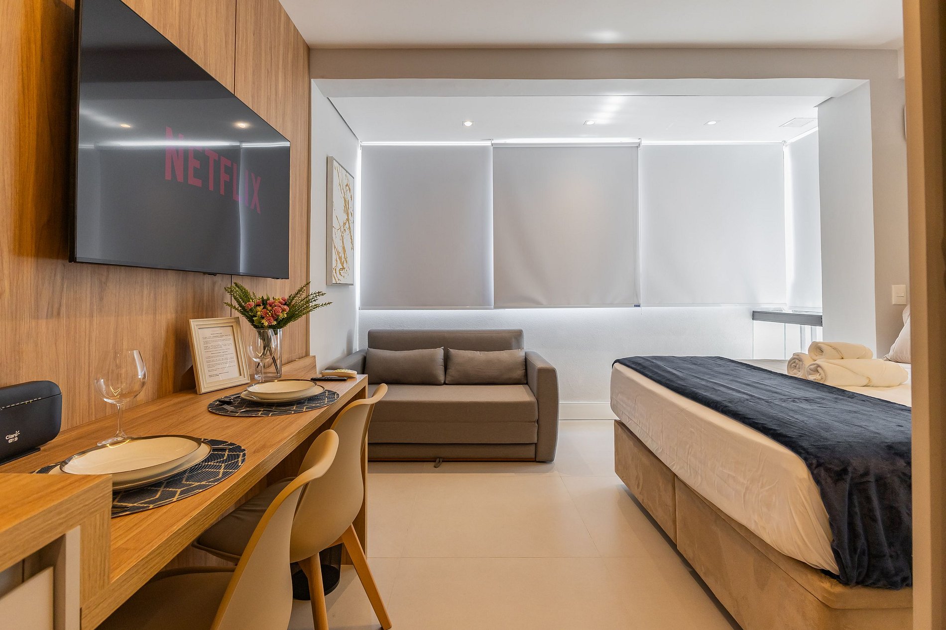 • Studio para até 4 pessoas, com cama queen e sofá-cama casal, acomodando com conforto;