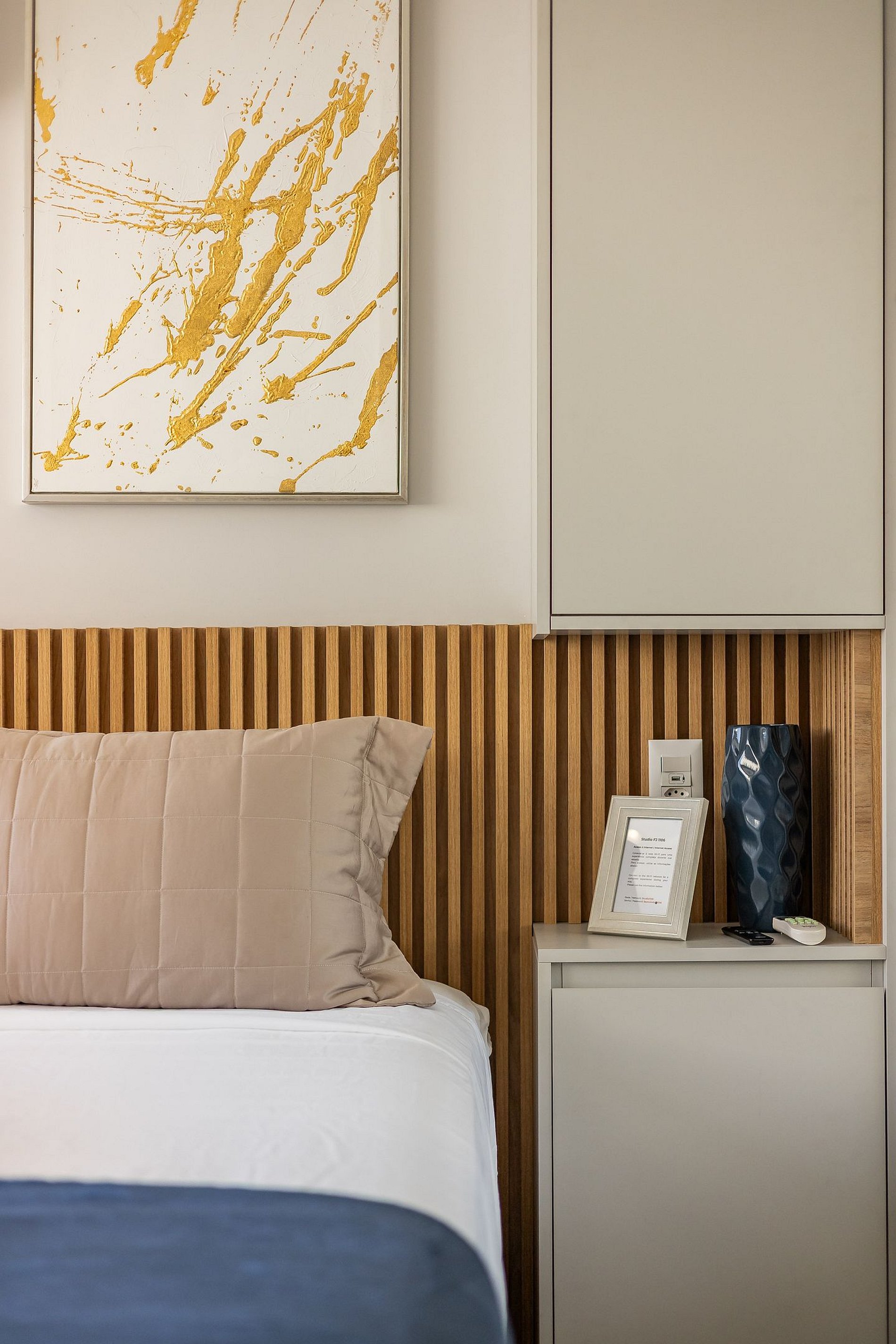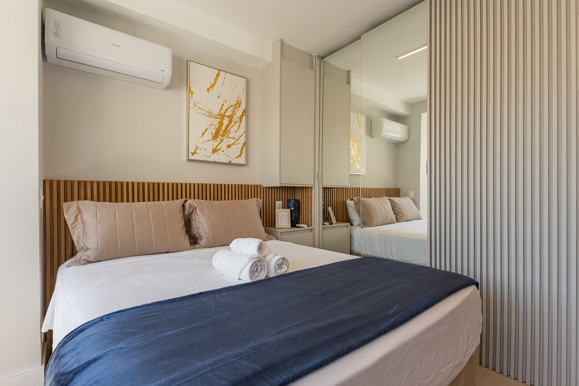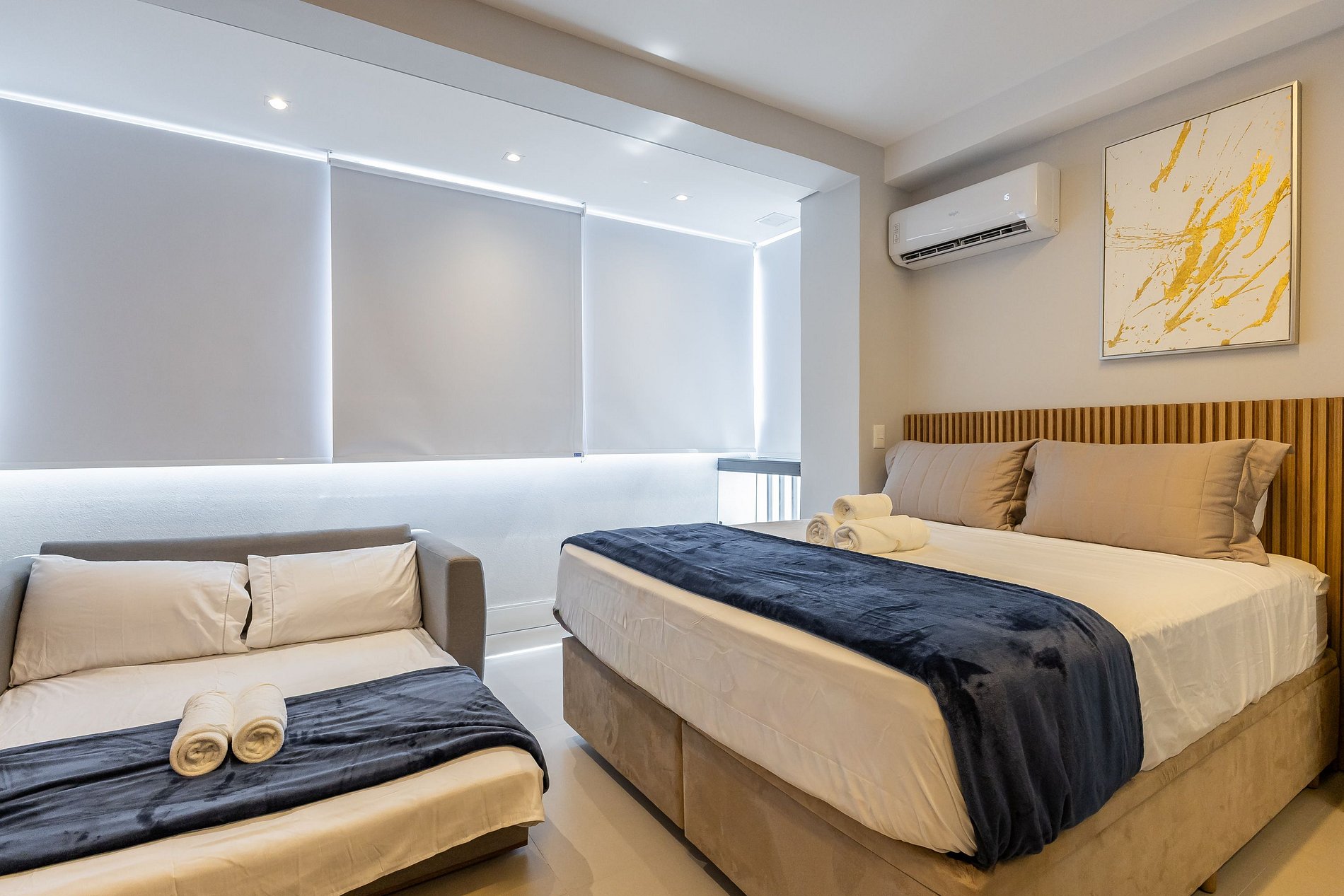 - Ar-condicionado, cama queen, sofá-cama casal e cortinas black-out