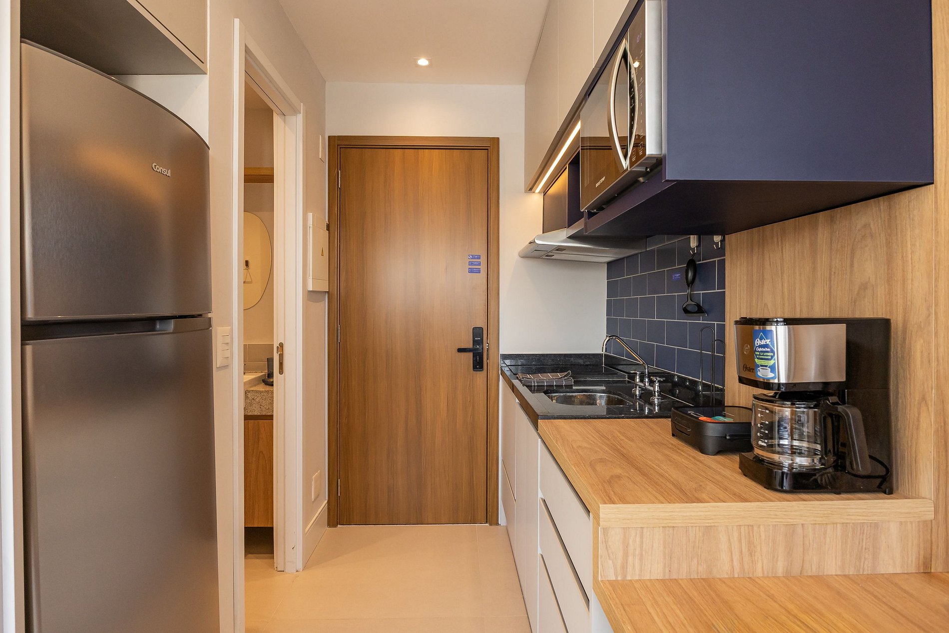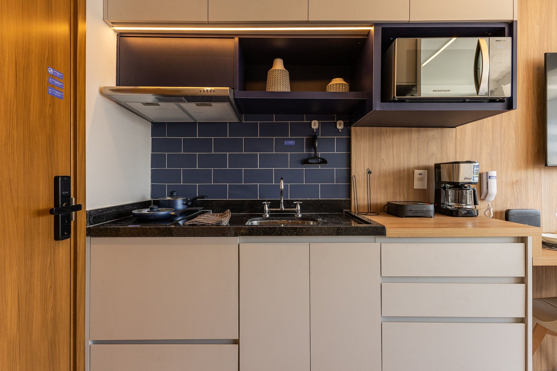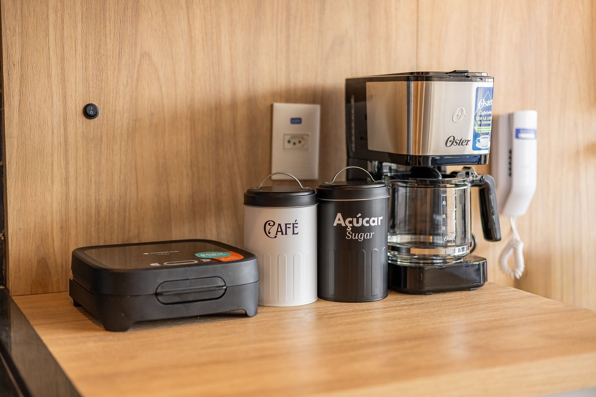 • Cozinha equipada com geladeira, cooktop por indução, micro-ondas, sanduicheira, máquina de café, filtro de café e utensílios de cozinha;