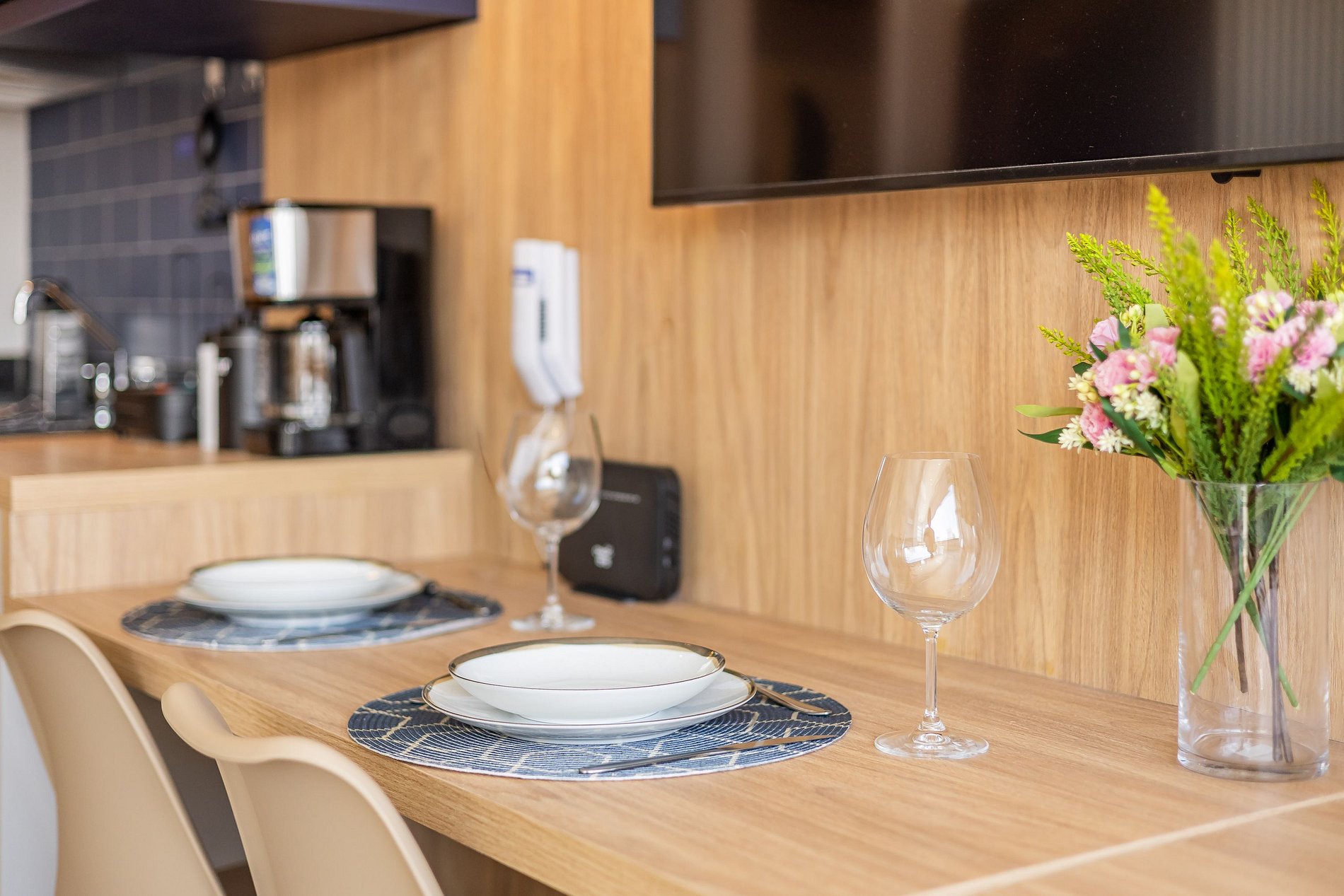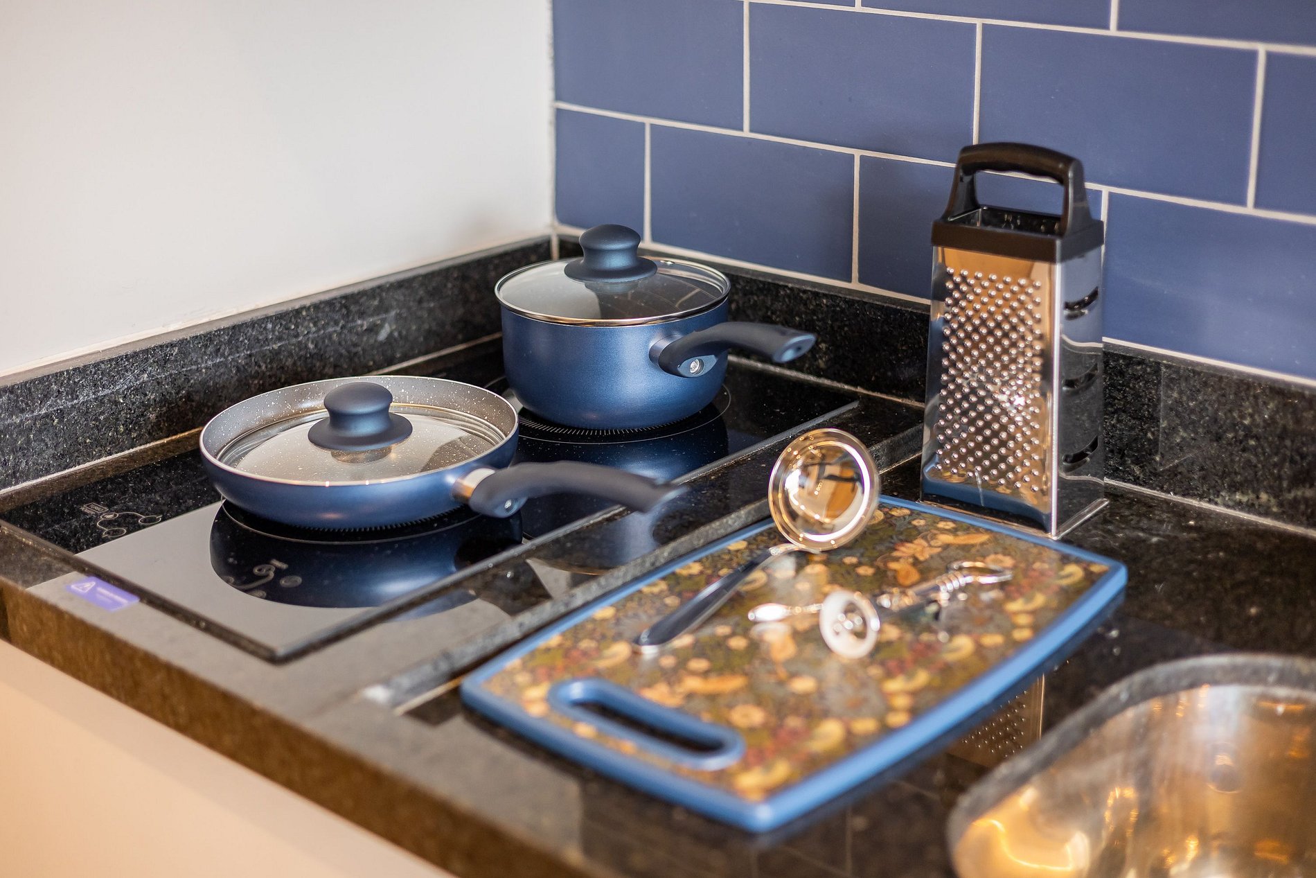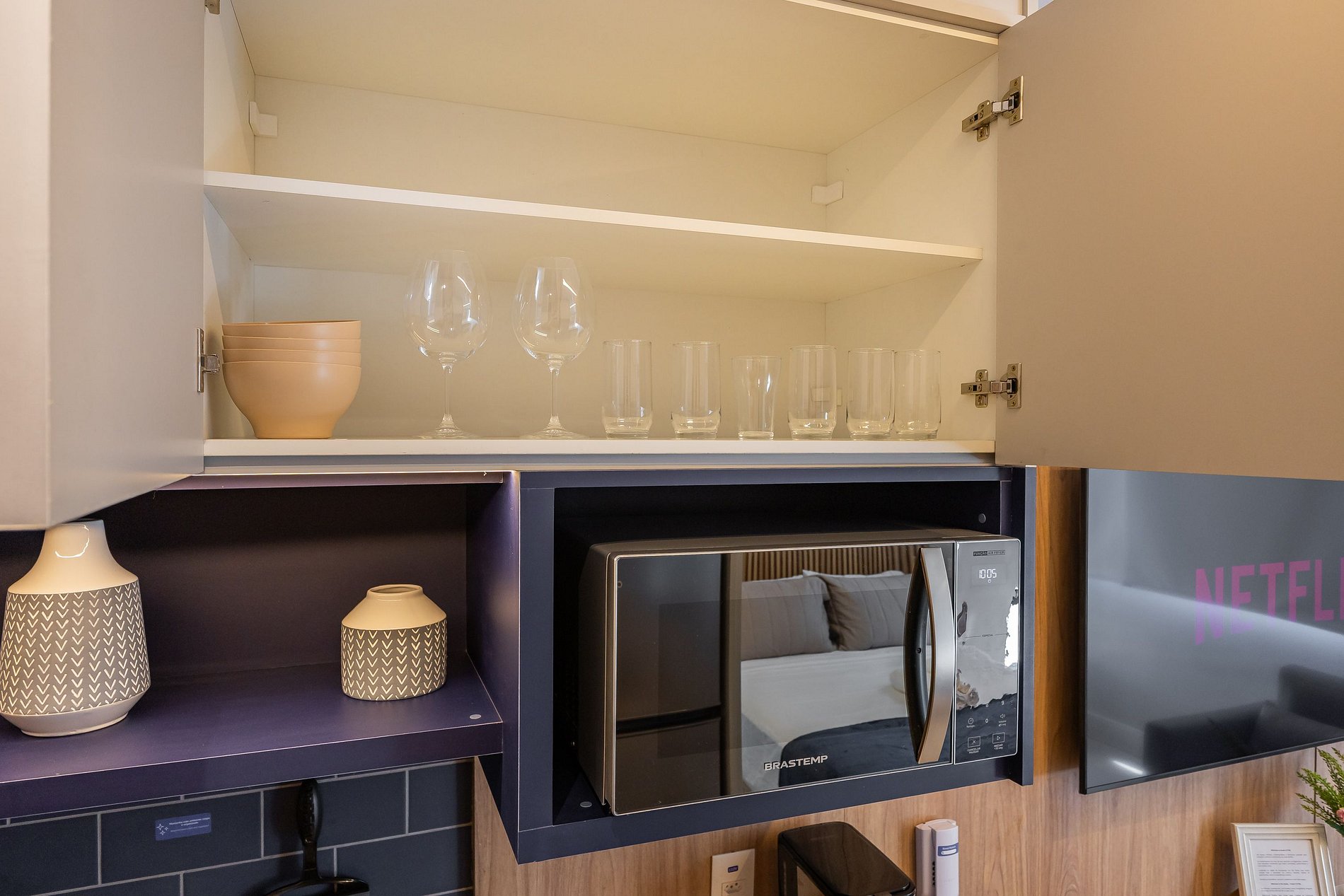 • Cozinha equipada com geladeira, cooktop por indução, micro-ondas, sanduicheira, máquina de café, filtro de café e utensílios de cozinha;