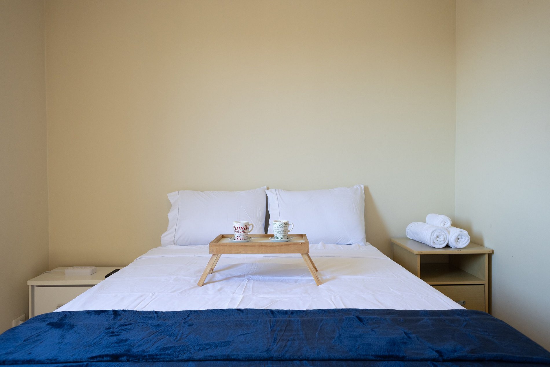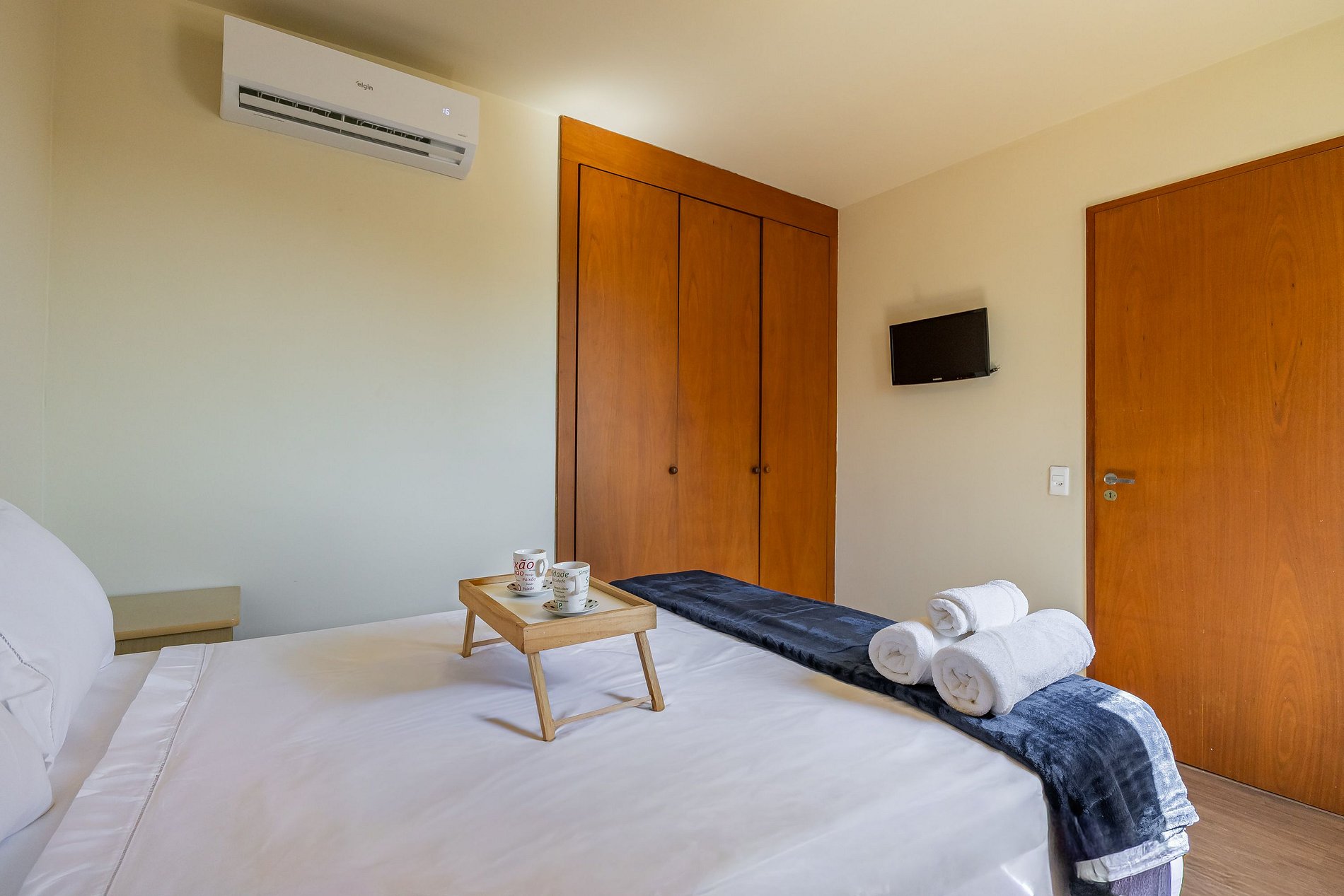• Quarto com cama de casal, ar-condicionado, guarda-roupas, cabides e cortinas black-out;