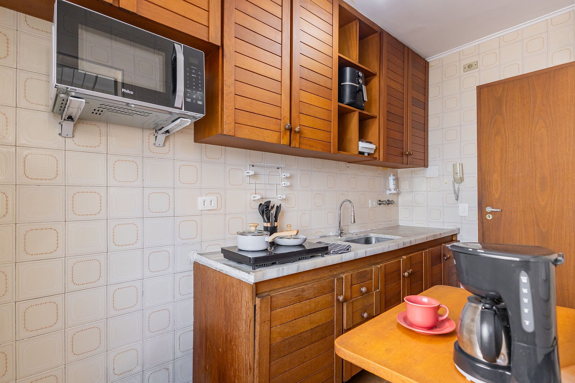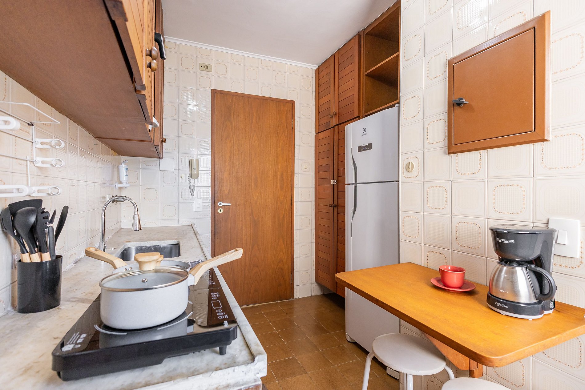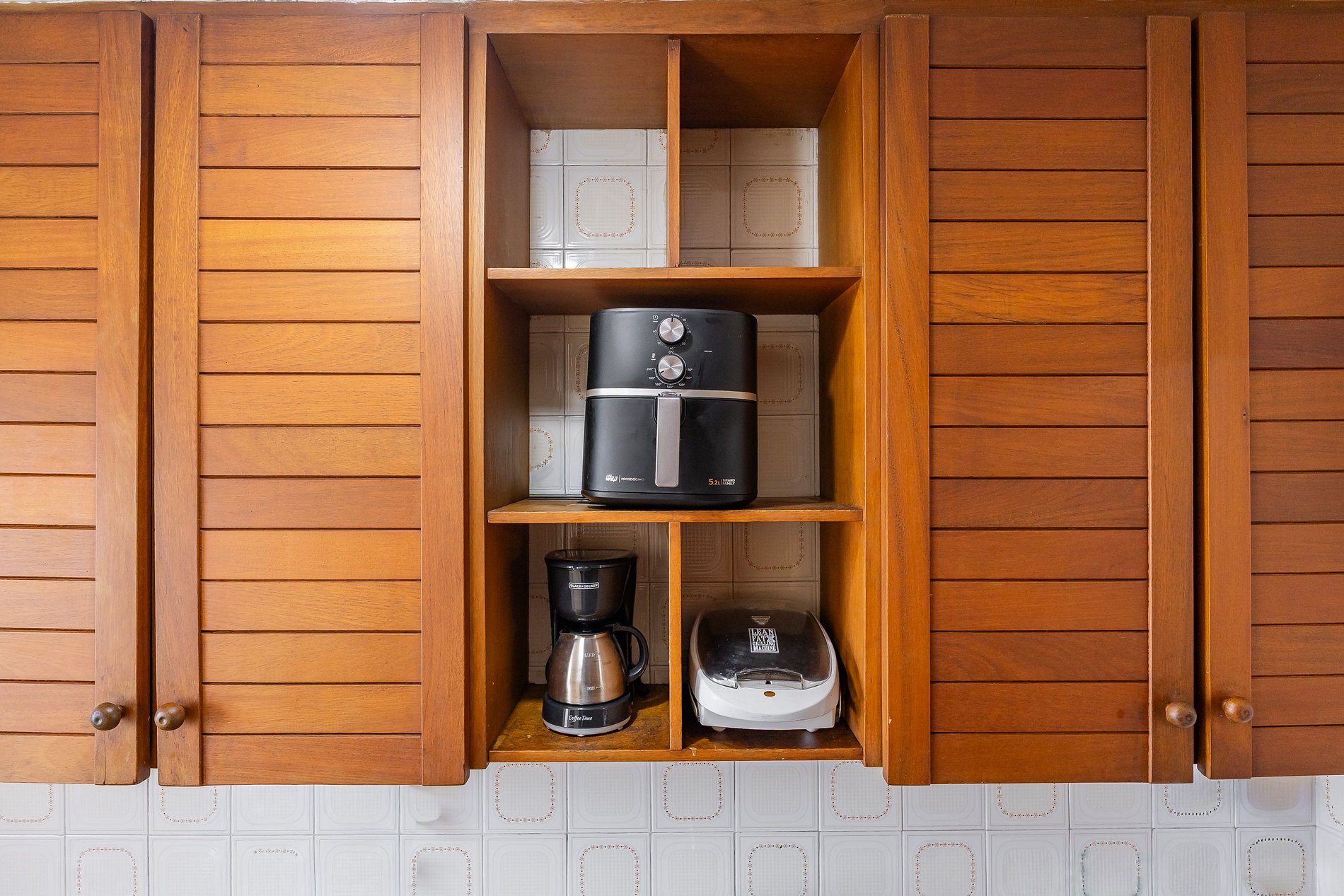 • Cozinha equipada com geladeira, cooktop por indução, micro-ondas, air fryer, máquina de café, sanduicheira e utensílios de cozinha;