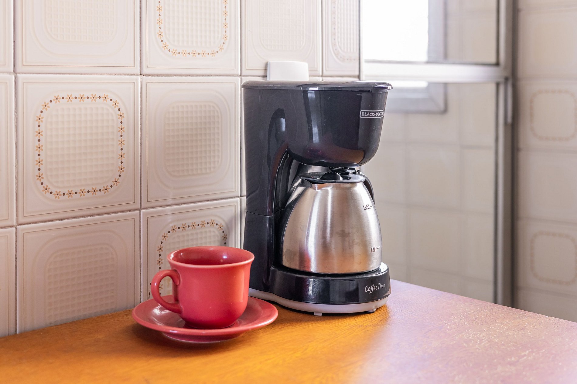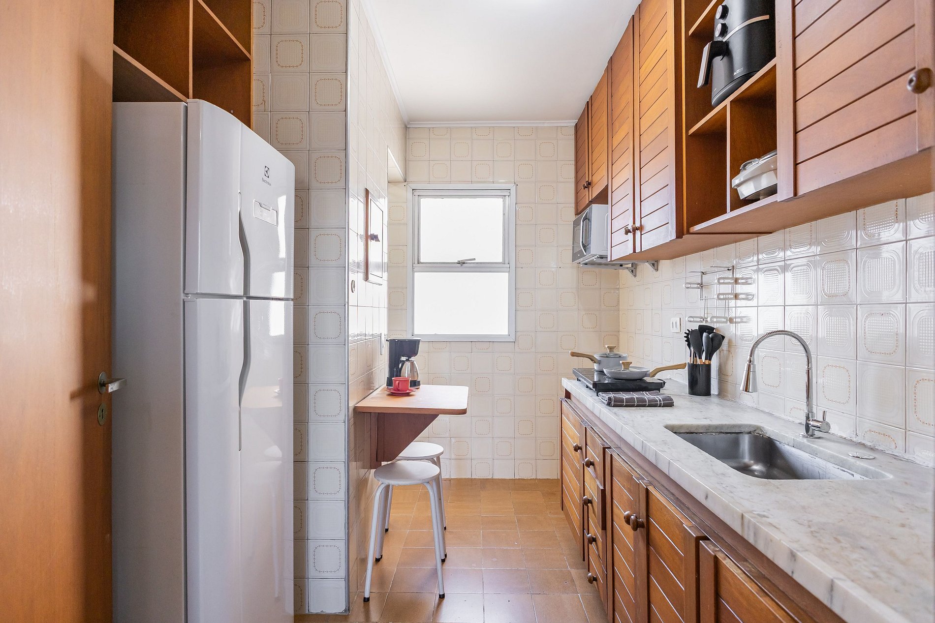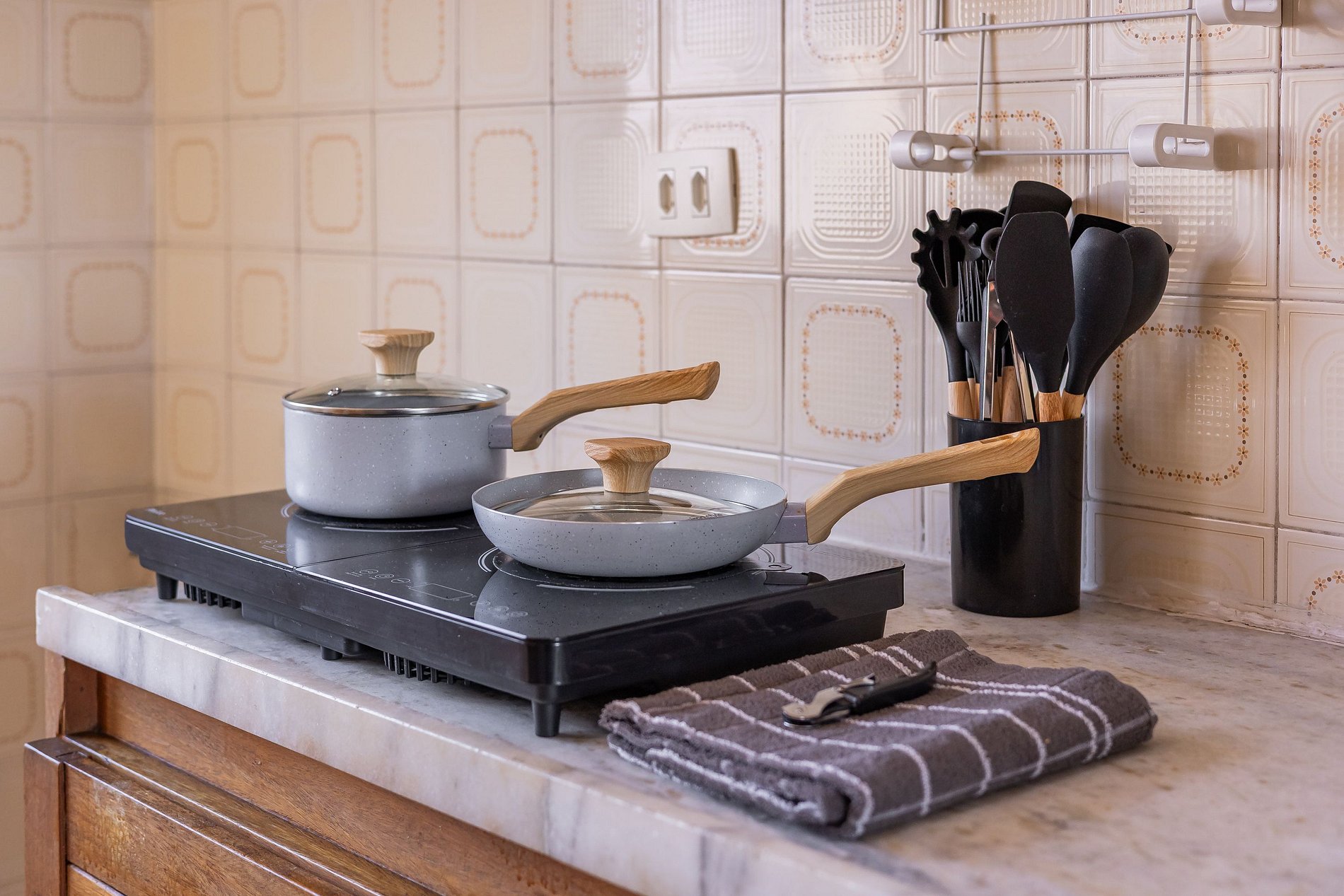 • Cozinha equipada com geladeira, cooktop por indução, micro-ondas, air fryer, máquina de café, sanduicheira e utensílios de cozinha;