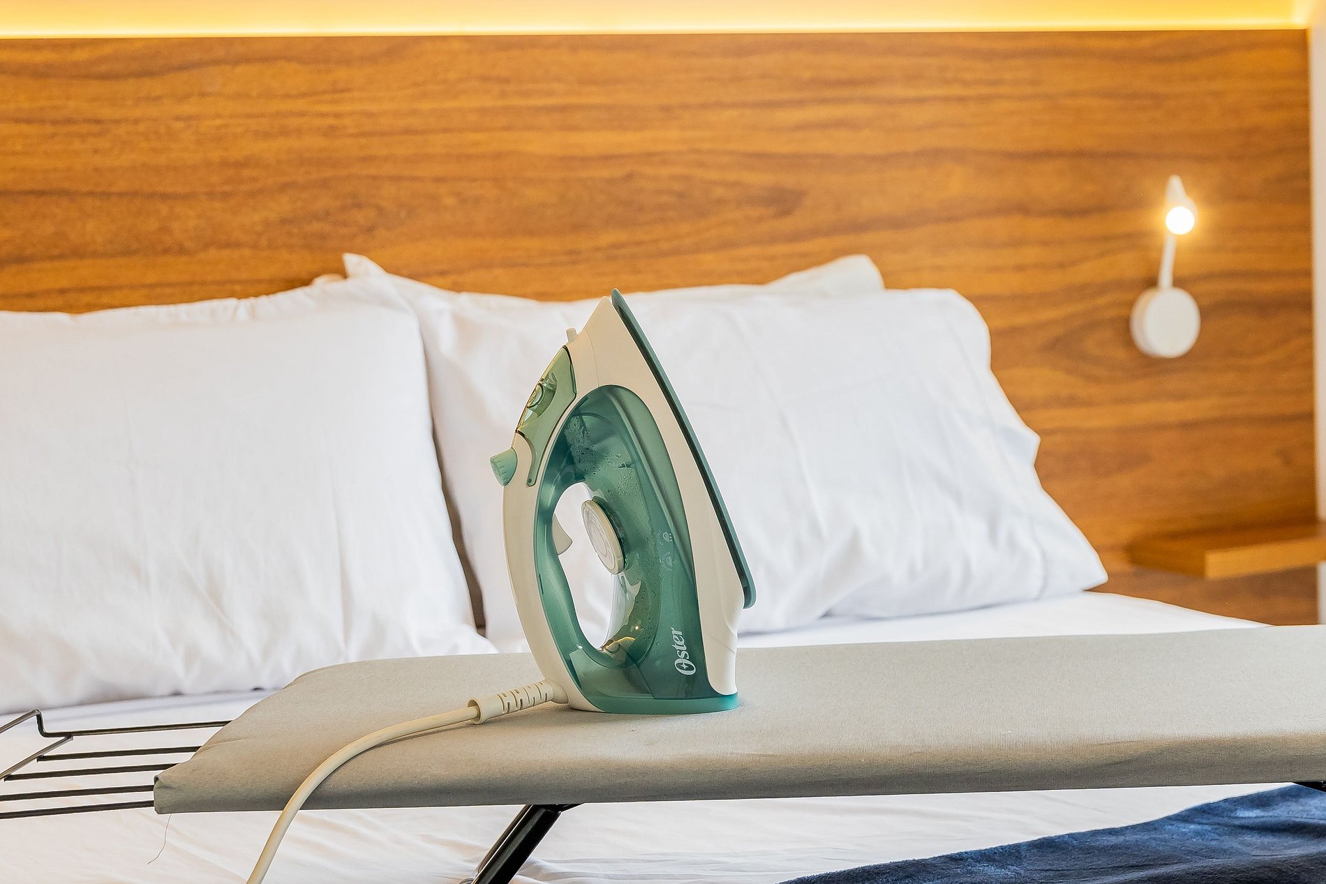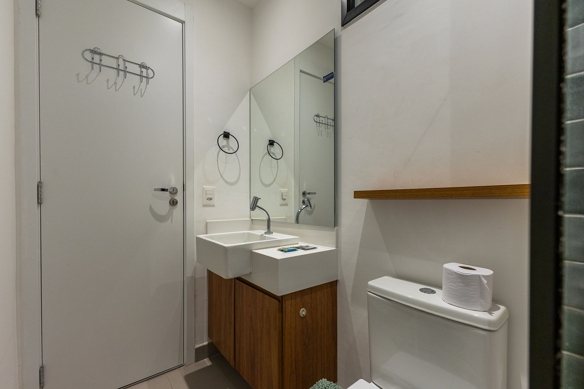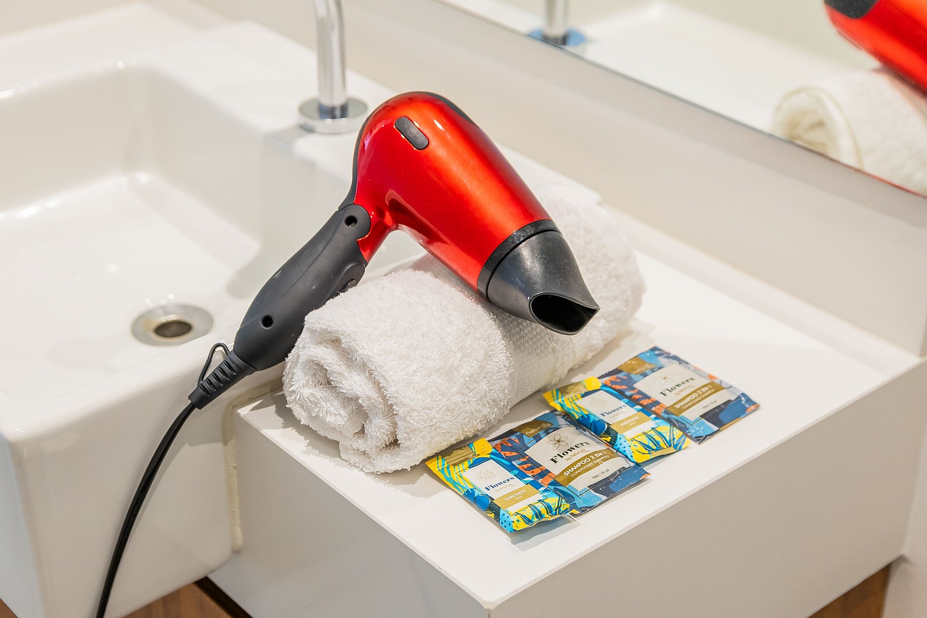 • Banheiro moderno com secador de cabelo, ferro de passar e itens essenciais.